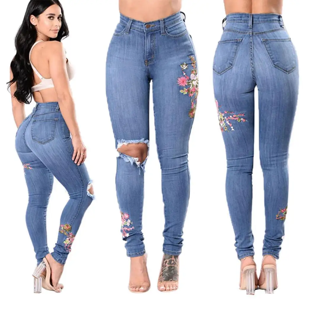 - Женские узкие джинсы с эластичной цветочной вышивкой.
