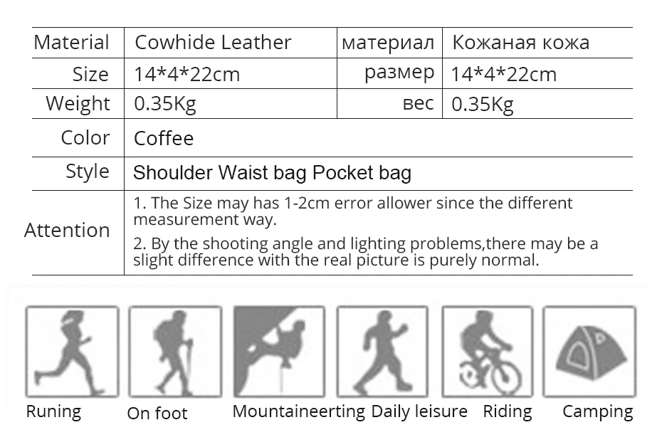 1. Прочная сумка для ног из натуральной кожи: Эта сумка для ног изготовлена из натуральной кожи, Высококачественная молния и прочный зажим для ремня. Идеально подходит для путешествий, работы, школы, спорта, пеших прогулок, охоты, езды на велосипеде, рыбалки, ходьбы, бега и т. д. и ежедневного использования. Идеальный подарок на Рождество, Новый Год, спасибо за День благодарения, жениха, день рождения, День отца. 2. Предназначен для комфорта: хорошая конструкция, модный дизайн, удобная переноска, износостойкая, водонепроницаемая, дышащая. Достаточно места для переноски вашего мобильного телефона, очков, небольших книг, ключей, ручек, карт, фонариков, перчаток, зарядных устройств, power bank и т. д. 3. многофункциональное использование: эта стильная сумка может использоваться в качестве поясной сумки, сумки до бедра, сумки через плечо, сумки через плечо, сумки для путешествий, сумки для улицы, рюкзака, отлично подходит для взрослых мужчин, мальчики. Средний размер, легко положить его в рюкзак, сумку для багажа или чемодан во время путешествия. Особенности: Материалы: ВИНТАЖНАЯ Натуральная Воловья кожа (высокое качество); Размер: 14 см (Ш) x4см (D) x22см (В) (5,5 "* 1,5" * 8,6 ") приблизительно; Вес: около 350 г; Цвет: кофейный; Теплые советы: 1. Ручное измерение может отличаться на 1-2 см. 2. Освещение, дисплей и другие факторы могут вызвать цветовое затенение, пожалуйста, всесторонние изображения и текстовые описания, чтобы определить! В комплект входит: 1x Geniune кожаная сумка для ног
