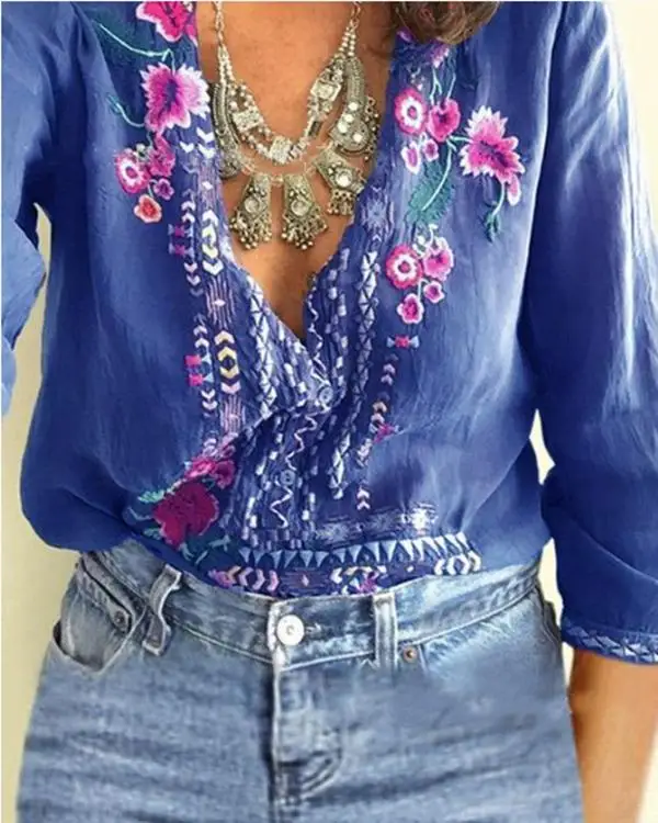 Женские блузки больших размеров 3XL, летние топы, Новая повседневная блузка, белые свободные рубашки с цветочным принтом и v-образным вырезом и полурукавами
