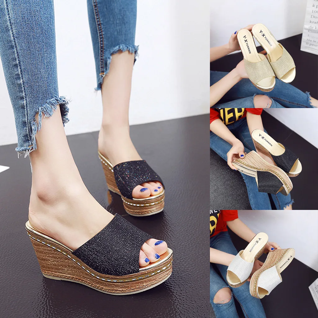 Женские шлепанцы с блестками; Повседневные летние туфли на танкетке; Модные Нескользящие пляжные шлепанцы