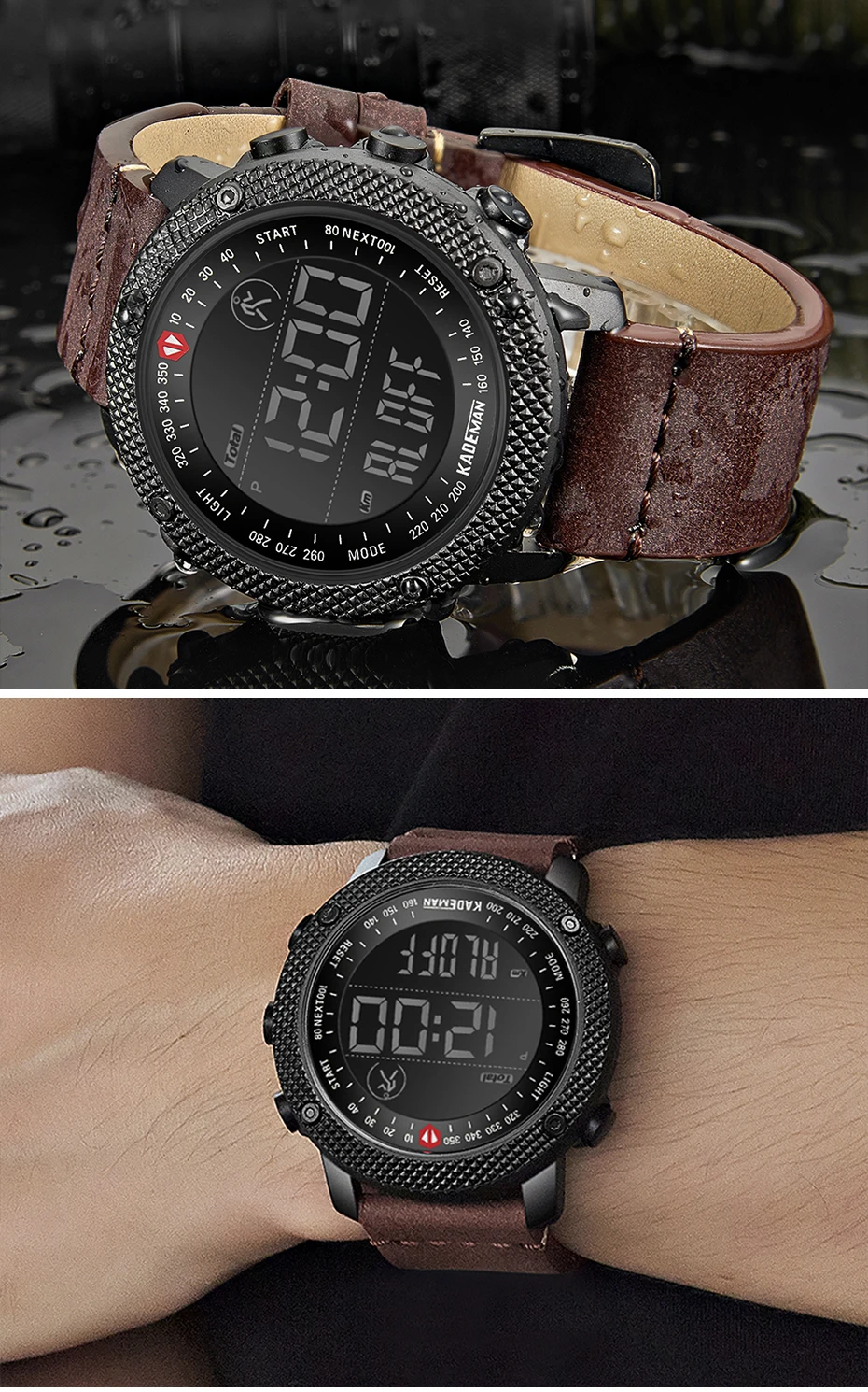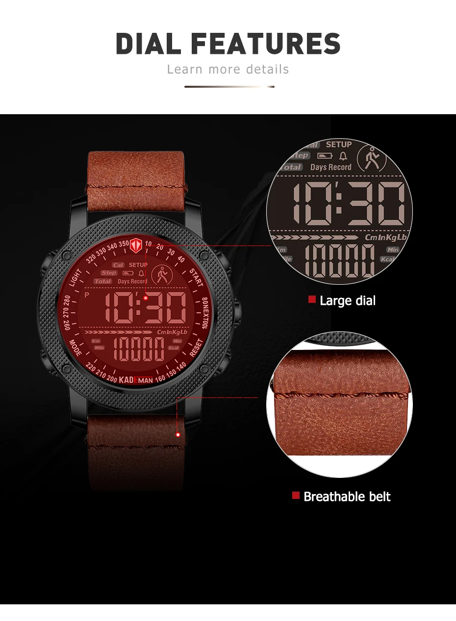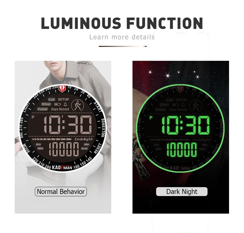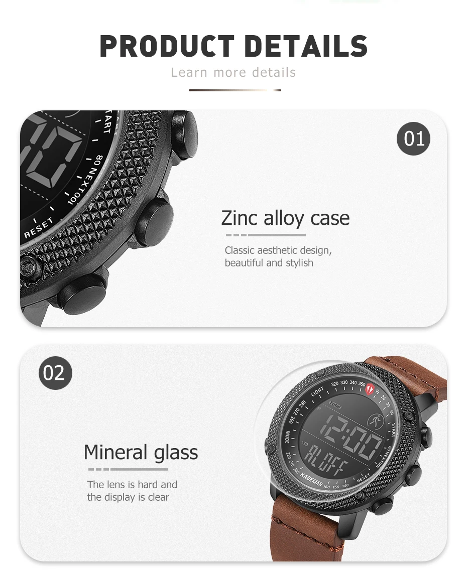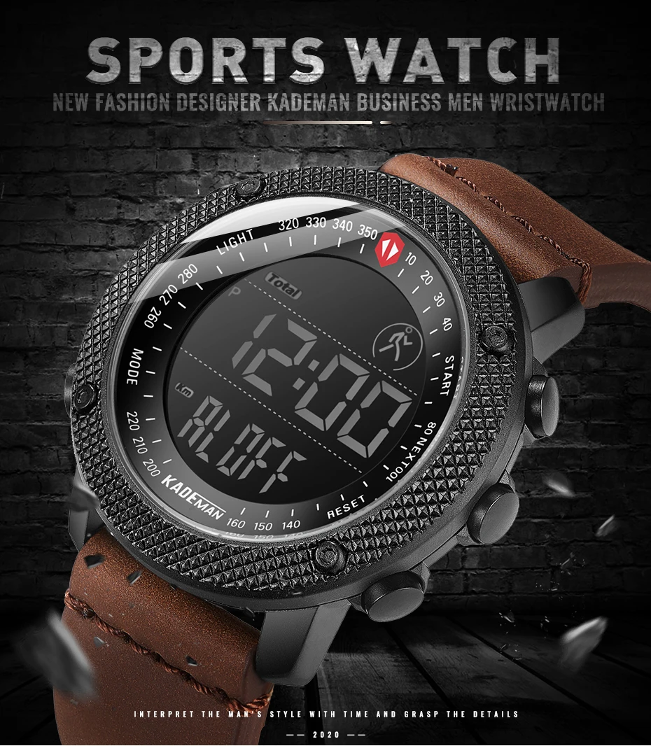 Бренд: KADEMAN Серия: K6121 Часовой механизм: цифровой часовой механизм Дизайн: клетчатый элемент; Многофункциональный Стиль: Модный спортивный; Открытый; Военный Основные Особенности -100% оригинальный бренд наивысшего качества -Водонепроницаемость 3 АТМ/30 м -Чехол из нержавеющей стали