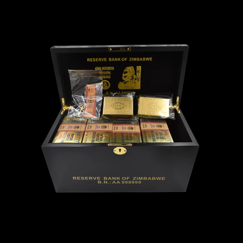 Название:1200 шт, в Zimbabwe вийском стиле, сто триллионов, долларовая Золотая банкнота, водяной знак и 120 сертификатов с деревянной коробкой для подарка