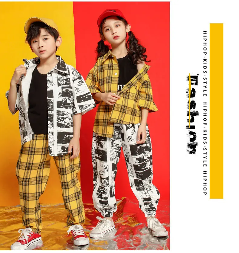 Детская одежда в стиле хип-хоп танцевальный костюм для девочек, куртка укороченный топ на бретелях, рубашка в клетку штаны для бега, одежда для бальных танцев, Одежда для танцев
