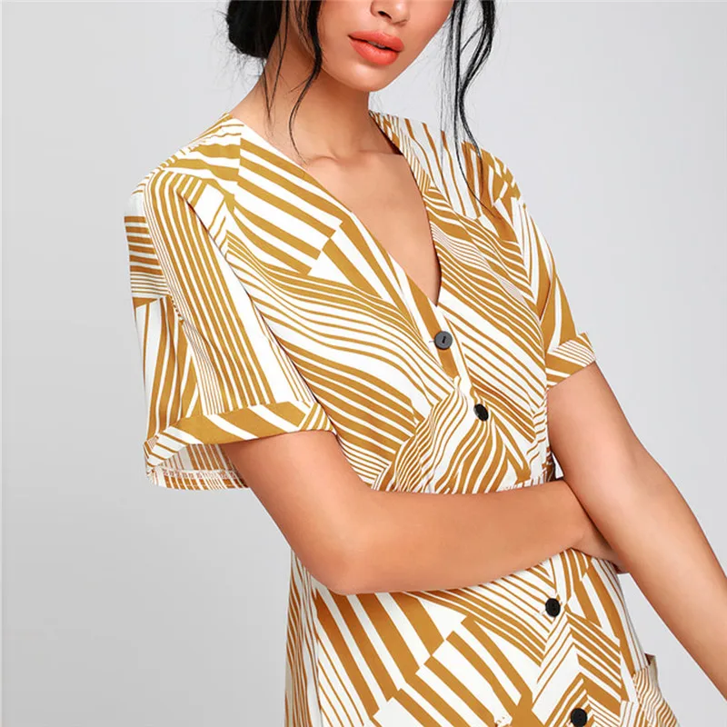 Женское платье с коротким рукавом JAYCOSIN, Повседневное платье миди в полоску с v-образным вырезом и пуговицами, модное элегантное платье
