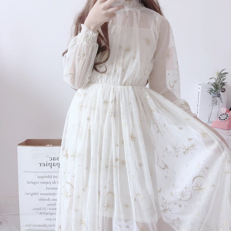 Женское фатиновое платье из 2 предметов в японском стиле Харадзюку, бежево-серое вечернее платье с вышивкой в виде Луны, Элегантное Длинное Сетчатое платье QV776, 2019