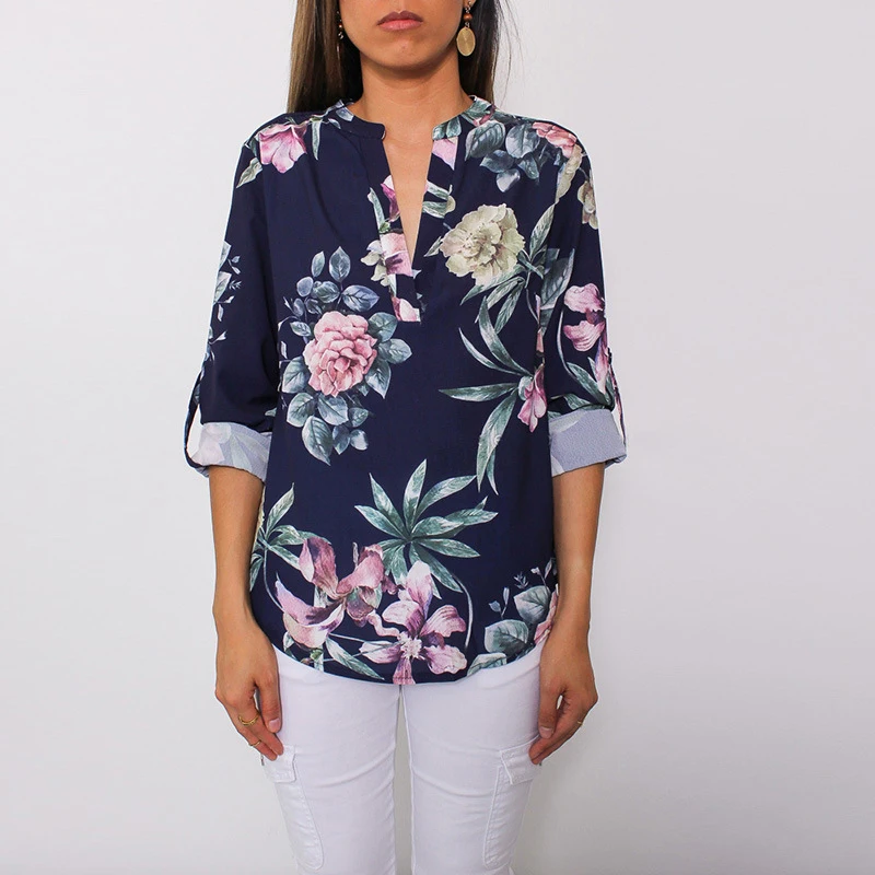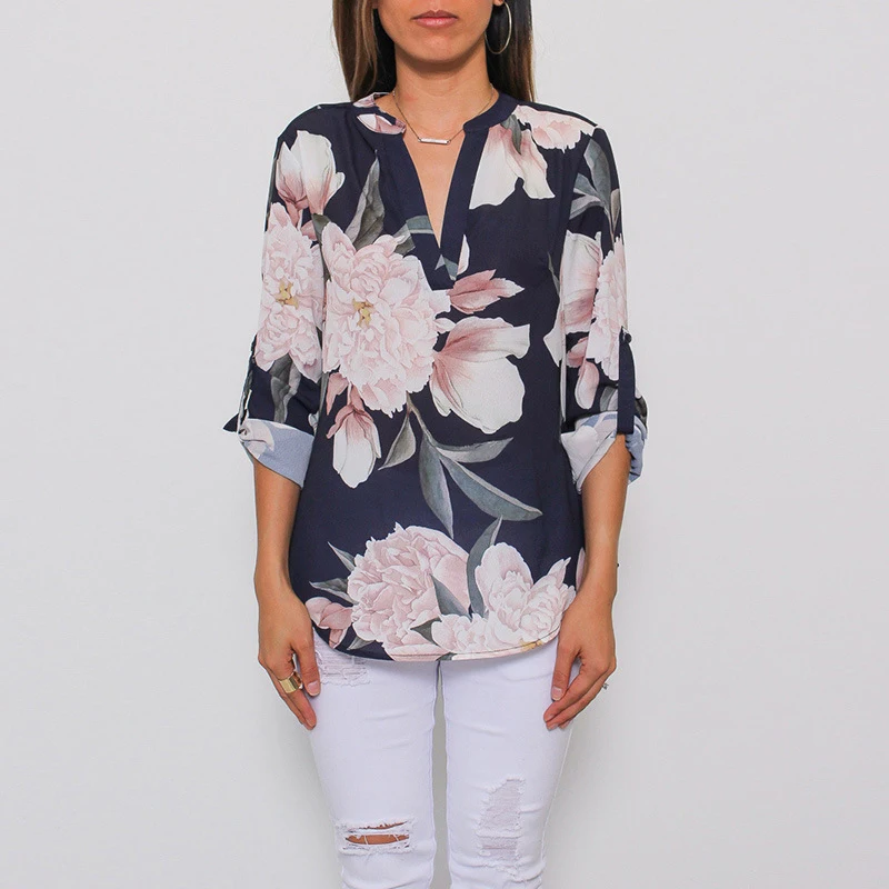 Женские топы с длинным рукавом, v-образным вырезом и цветочным принтом
