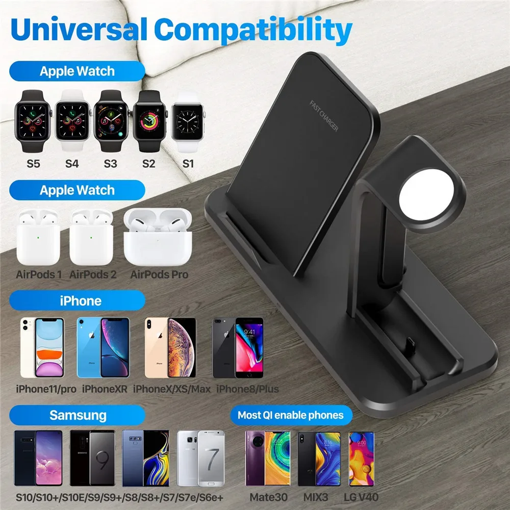 1) многофункциональное Беспроводное зарядное устройство 3 в 1: идеально заряжает ваш iPhone/Apple Watch /Airpods/в то же время, только нужен Кабель-адаптер может питать все устройства apple 2) Если у Вас возникли какие APPLE WATCH и AIRPODS Подставка для зарядки: совместим с Apple Watch Series 5/4/3/2/1, совместимый с для Airpods обеспечивает вам опрятный Подставка для зарядки. 3) Отличный дизайн: дизайн 3 в 1 не только зарядная станция, но и подставка для телефона, держите вашу тумбочку аккуратной и аккуратной, попрощайтесь с бесконечным запутыванием шнуров. 4) совместимое устройство телефона: части телефона Поддержка 7,5 Вт Беспроводное зарядное устройство для быстрой зарядки совместим с iPhone XS/Xs Max/XR/X/8/8 Plus,10 Вт совместим с Samsung Galaxy S20/S10/S9/S9 Pluste 9te 8 (Используйте адаптер питания 9 В/1,67 А).