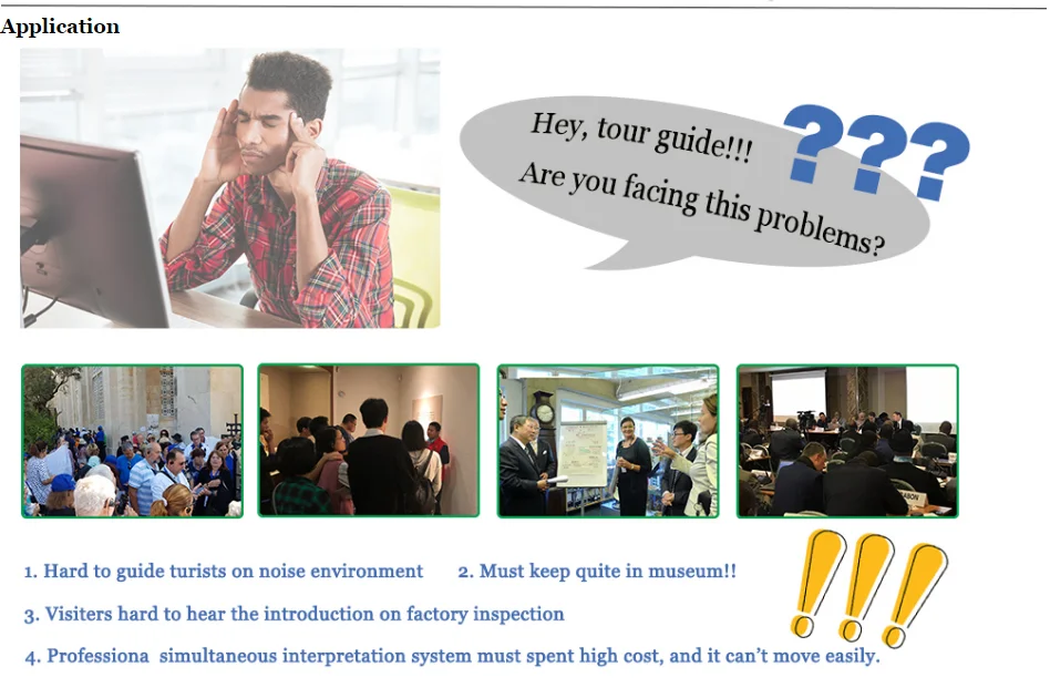 Эта беспроводная система гида разработана специально для гидов и групп. это облегченная Многоканальная система, которая помогает туроператорам внимательно слушать гид, улучшая эффект беспроводной/легкой презентации между гидом и сторонами.