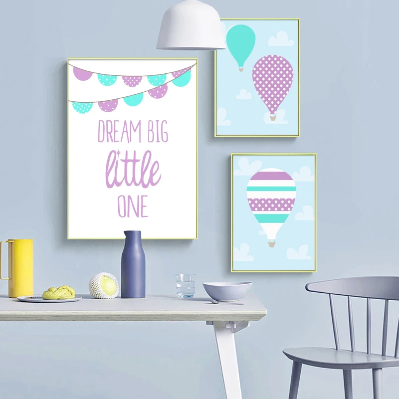 Детская Настенная картина для маленьких девочек, воздушный шар, мечта, Большая маленькая картина с цитатой, костюмы, фиолетовый и Аква, декор для детской комнаты