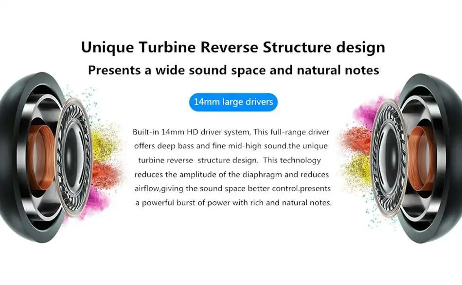 ● Приняты 14 мм блоки драйвера, турбо обратная и двойная конструкция полости, эффективная изоляция шума, улучшить звук мощного разрыва мощности.