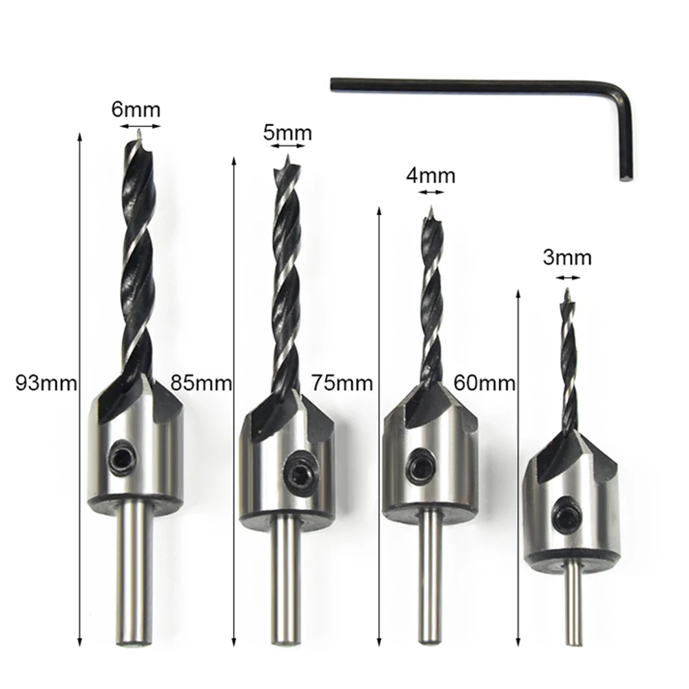 Набор из четырех частей включает в себя биты для сверления пилотных отверстий для винтовых размеров 3 мм, 4 мм, 5 мм, 6 мм.
