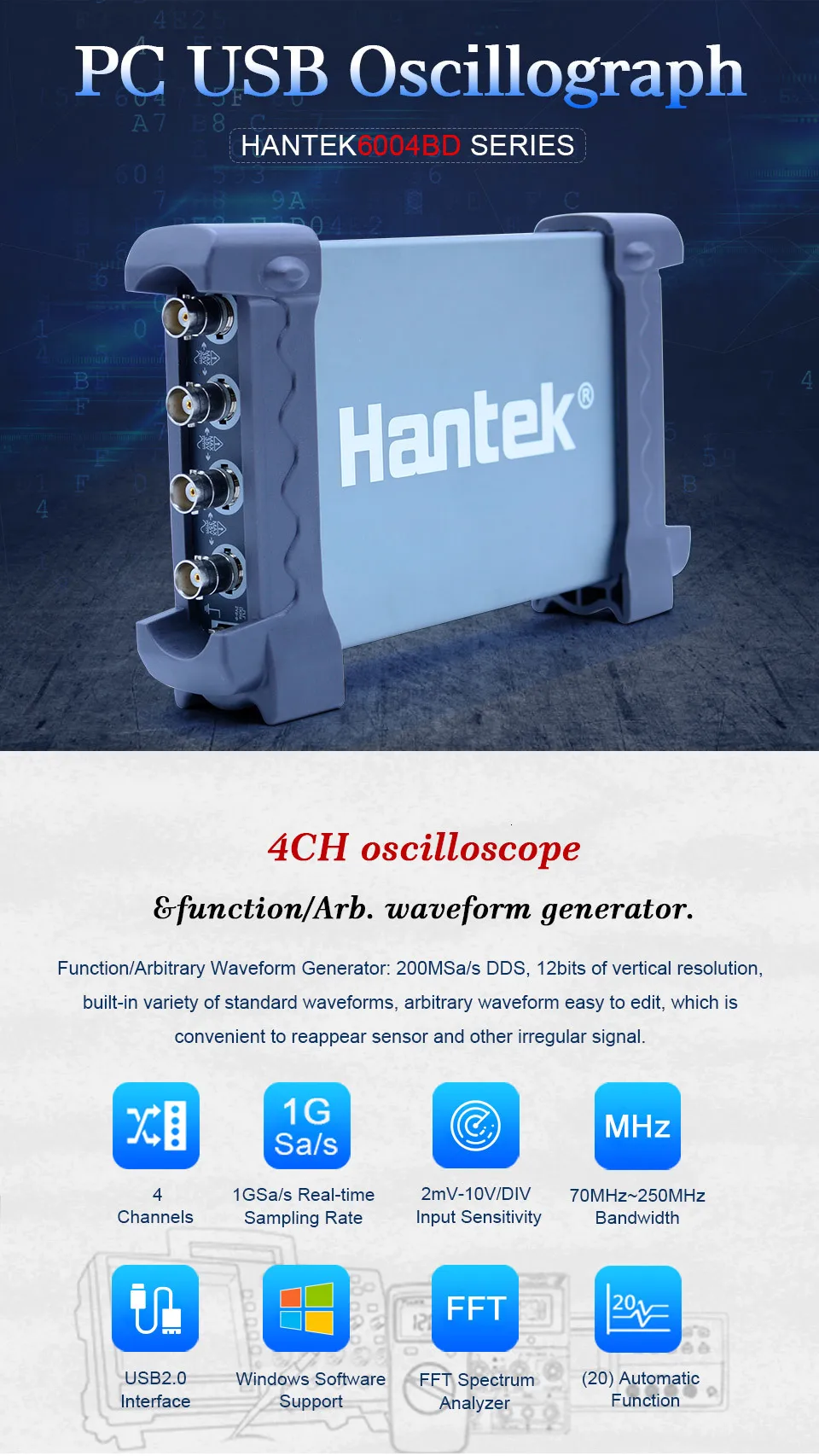 Hantek 4CH осциллографы 70 МГц ~ 250 МГц USB 2,0 Ручной осциллограф для ПК DDS/Arb генератор сигналов 6204BD/6254BD/6104BD/6074BD