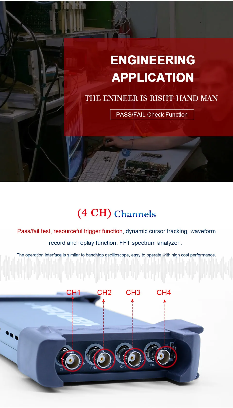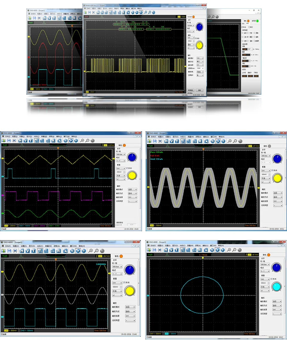 · Тест на пропуск/сбой, находчивая функция триггера, динамическое отслеживание курсора, запись формы волны и функция воспроизведения. Интерфейс работы похож на banchtop осциллограф, прост в эксплуатации с высокой производительностью.