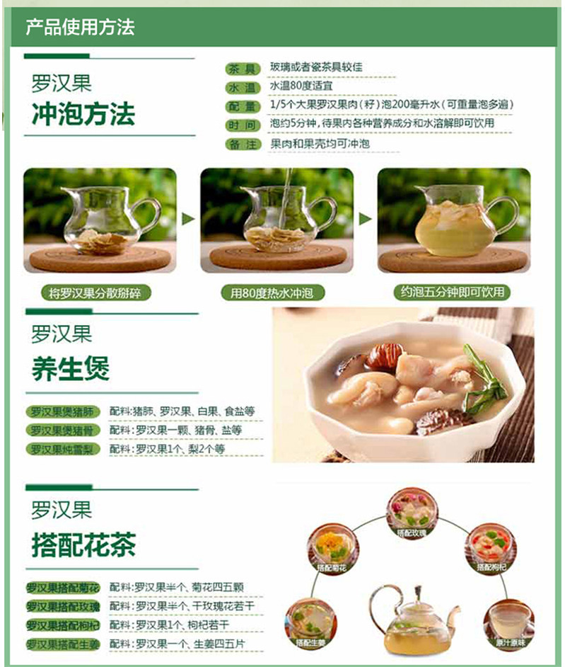 Чайный пакетик Momordica grosvenori изготовлен из сухофруктов, которые измельчаются при низкой температуре и суперфине. Фрукты используются в качестве лекарств. Он обладает сладким вкусом, прохладной природой, очищает тепло, увлажняет легкие и расслабляет кишечник. Он используется для легочного огня и сухого кашля, фарингалгии и афоны, сухости и запоров кишечника, вызванных ожирением и другими болезнями. Сирайтия гросвенорий обычно варится и отваривается, и ее цвет-это светильник для чая.