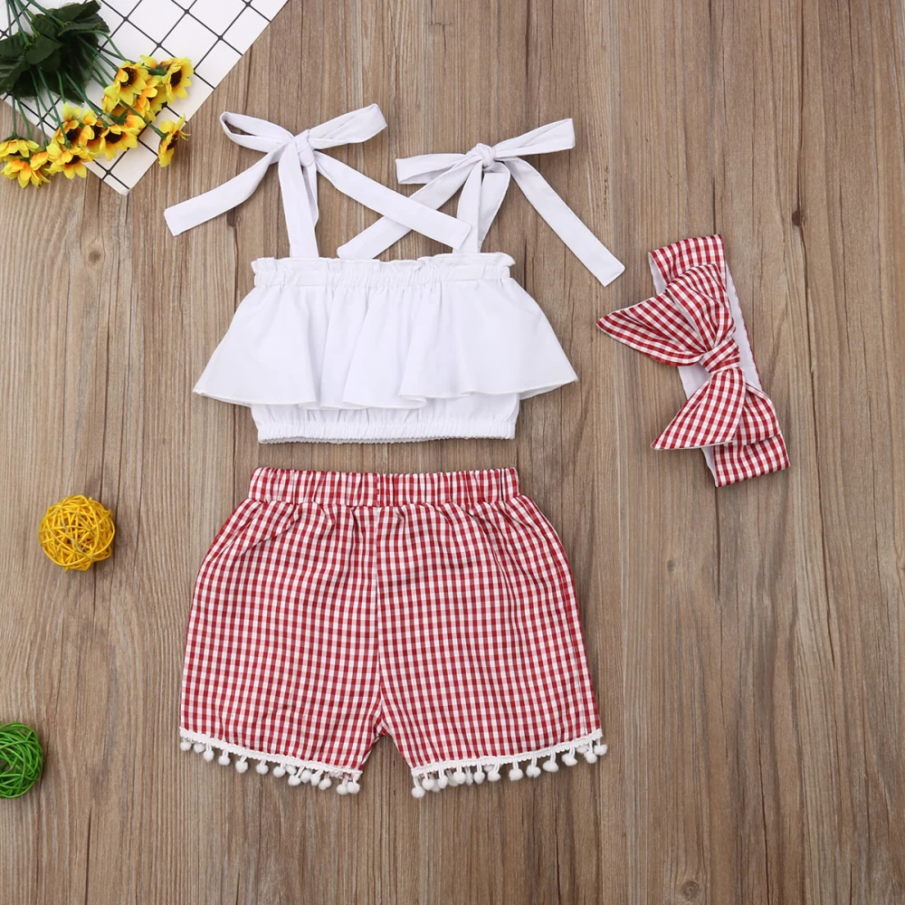 100% новый и высокое качество Модные детские комплекты одежды из 3 предметов для маленьких девочек! Модный дизайн, милый Размер: 80 90 100 110 120 Цвет: как на картинке Материал: 100% хлопок Упаковка: 1 Топ +1xШорты +1xПовязка на голову Таблица размеров: Обратите внимание: если ваш ребенок пухленький, мы рекомендуем выбрать больший размер, спасибо.