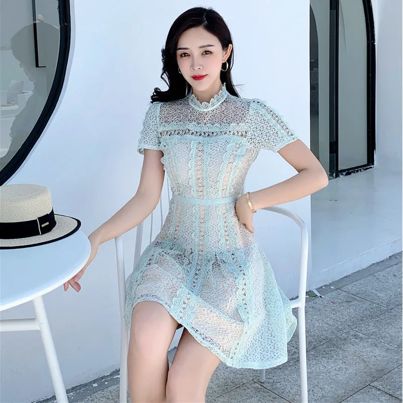 Женское кружевное платье-трапеция с воротником-стойкой на лето, Вечерние Платья До Колена для дня рождения