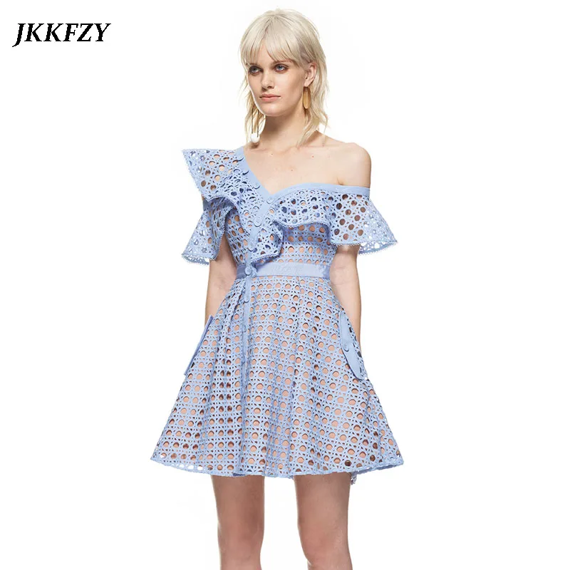 Весна 2020 новейшее синее сексуальное платье без рукавов с диагональным воротником ажурное кружевное ТРАПЕЦИЕВИДНОЕ мини-платье с открытыми плечами