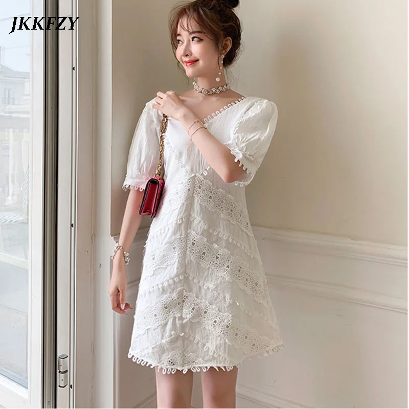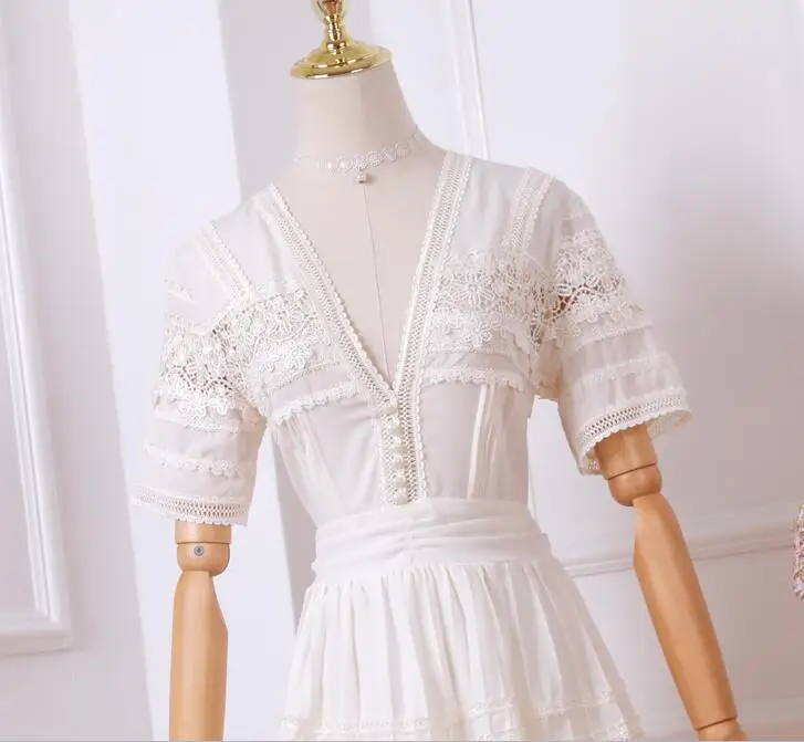 Женское кружевное сексуальное платье с коротким рукавом и v-образным вырезом, белое мини-платье трапециевидной формы с вышивкой, вечерние платья