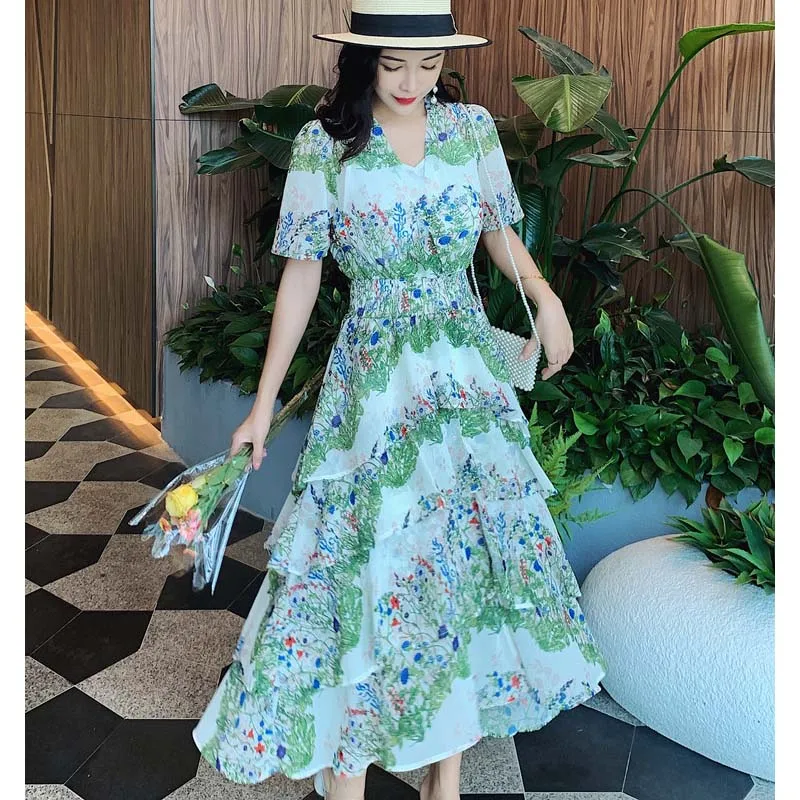 Длинное платье, женское летнее платье, новое платье с коротким рукавом и квадратным воротником, кружевные французские Платья с цветочным рисунком, Vestidos