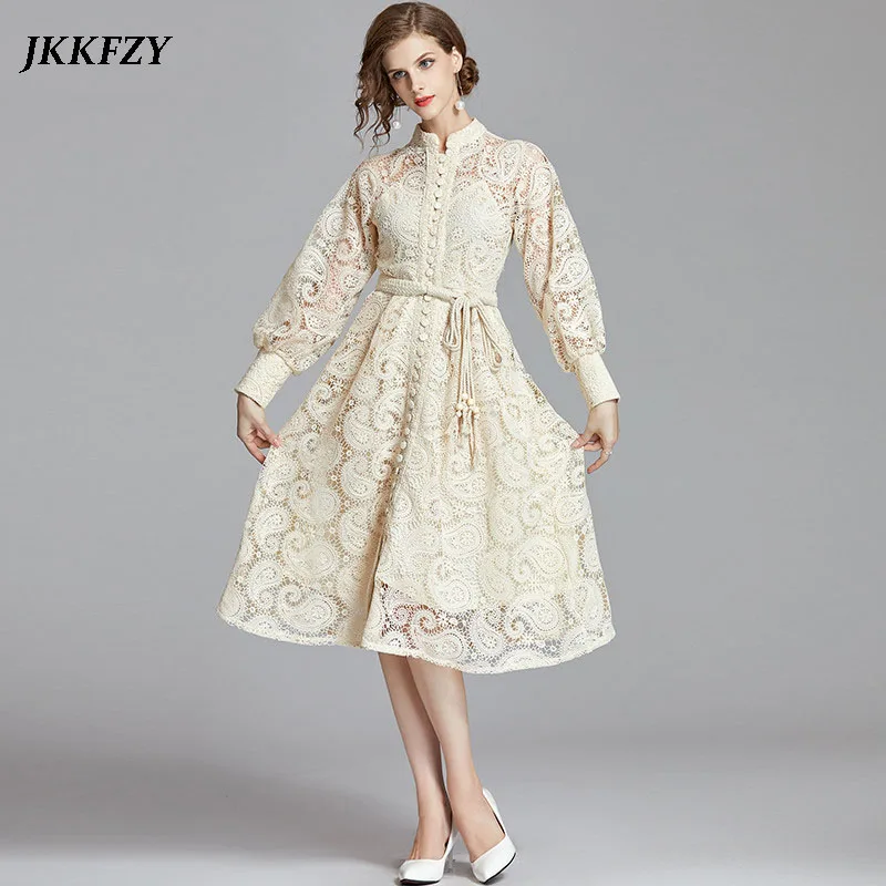 Винтажное ажурное кружевное платье с цветочной вышивкой 2020 Новое весеннее женское платье с воротником-стойкой и рукавами-фонариками с высокой талией и поясом