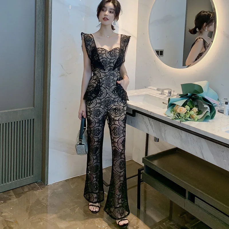 Весна-лето 2020, офисный женский черный сексуальный темпераментный комбинезон высокого качества, кружевной вырез, топ на молнии сзади