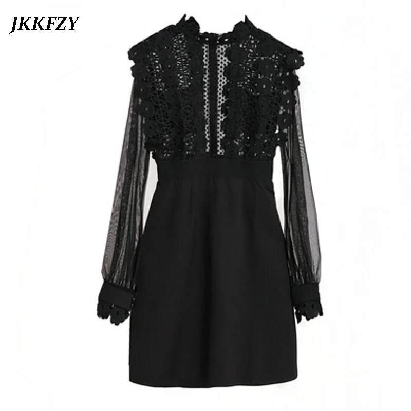 Женское черное кружевное платье, ажурное мини-платье с длинным рукавом и цветочной вышивкой, осень 2019