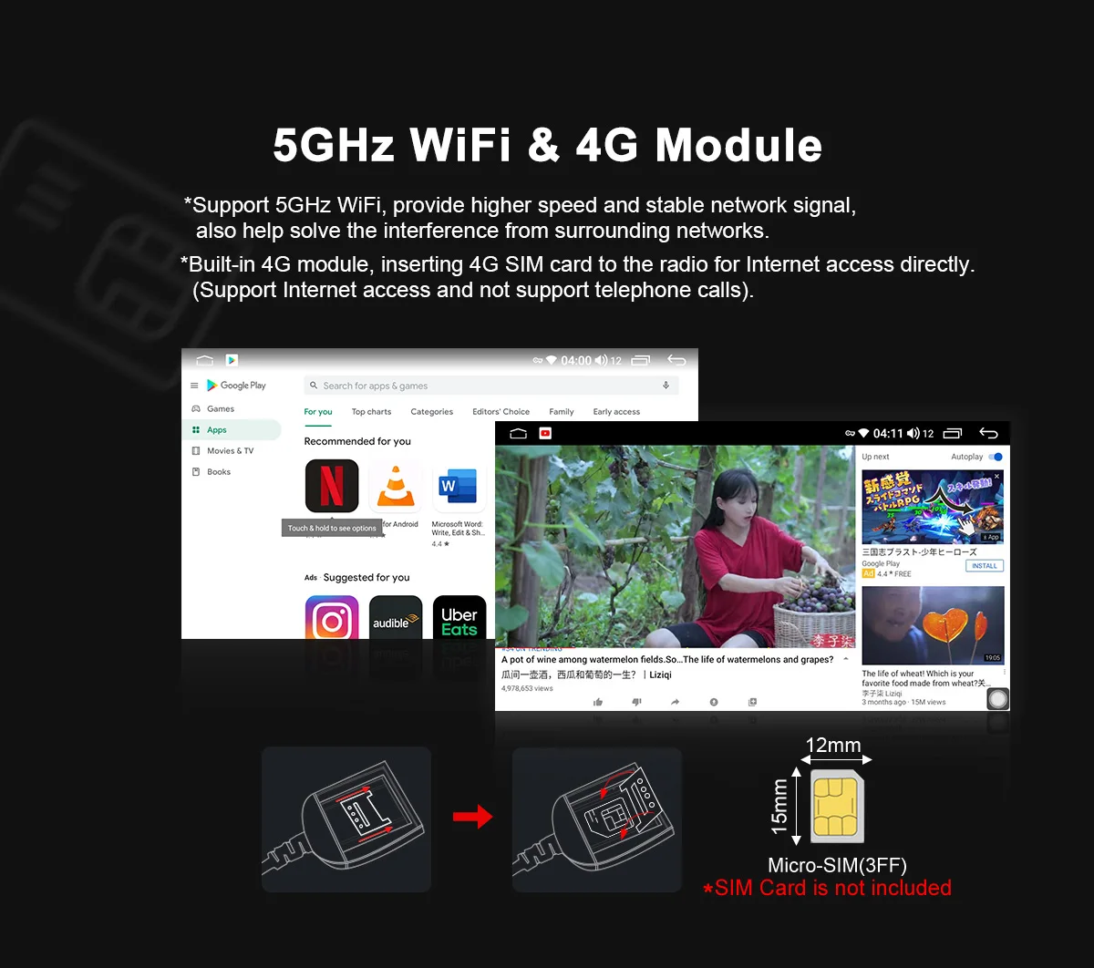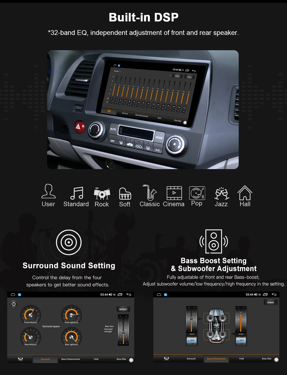 * Мощная система Android 10,0. * CPU:UIS7862 Восьмиядерный 1.8GHz@4.0GB (память) + 64 ГБ (память). * Встроенный Android Auto & Apply Wireless Carplay. * Встроенный слот для sim-карты. * Оптический выход и коаксиальный выход. * Встроенный DSP с 32-полосным эквалайзером. * 5 ГГц WIFI обеспечивает высокую скорость загрузки. * Радиочип TDA7786, чип усилителя: TDA 7851