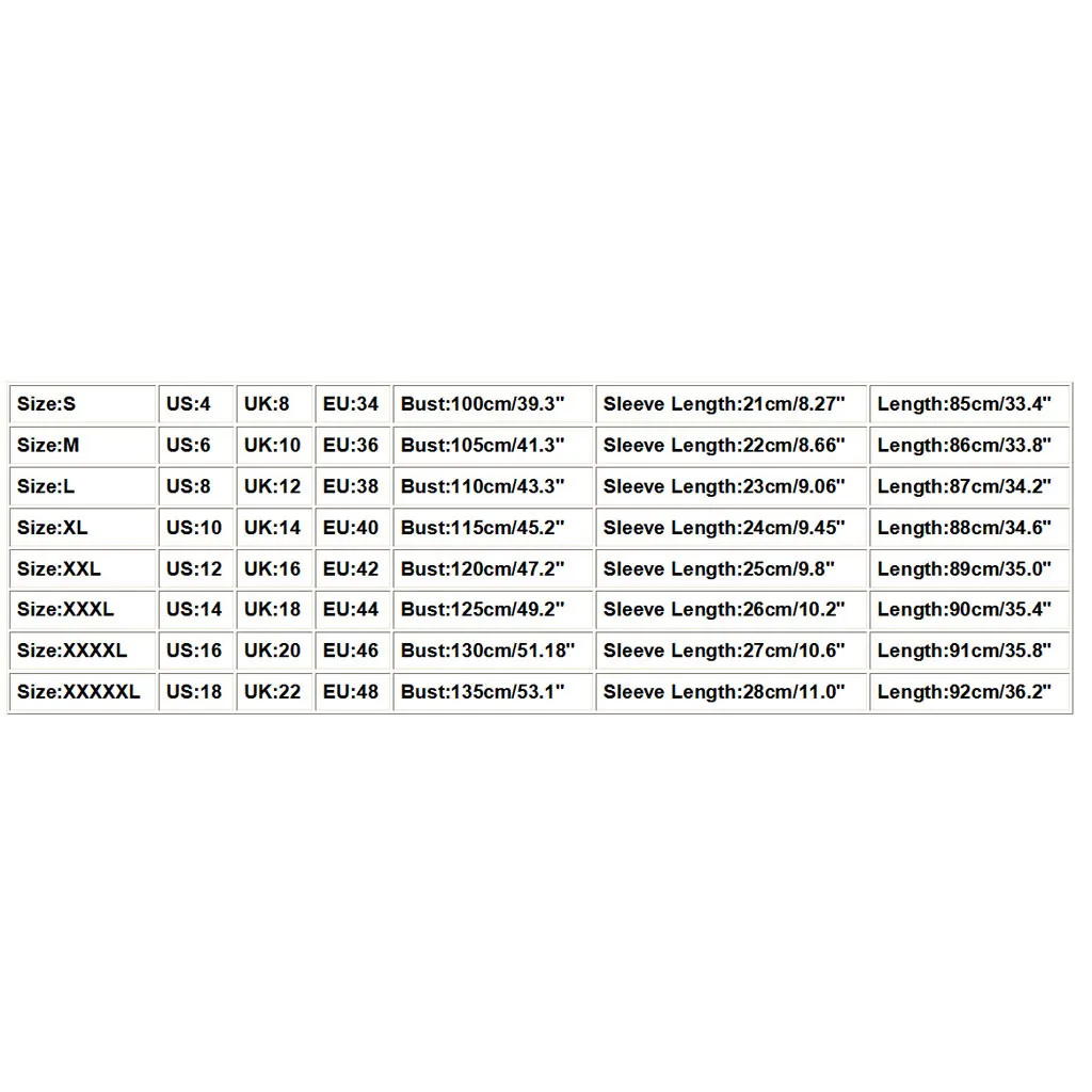 | Размер: XXXXL | США: 16 | Великобритания: 20 | ЕС: 46 | Обхват груди: 130 см/51,18 дюйма | Длина рукава: 27 см/10,6" | Длина: 91 см/35,8" |