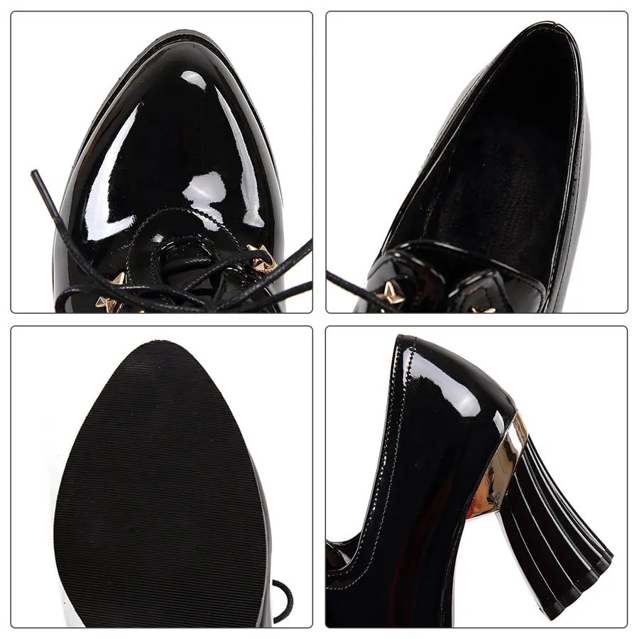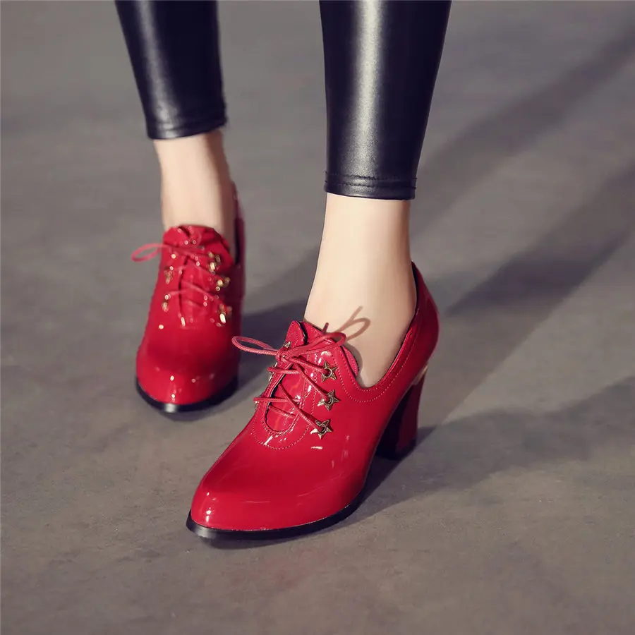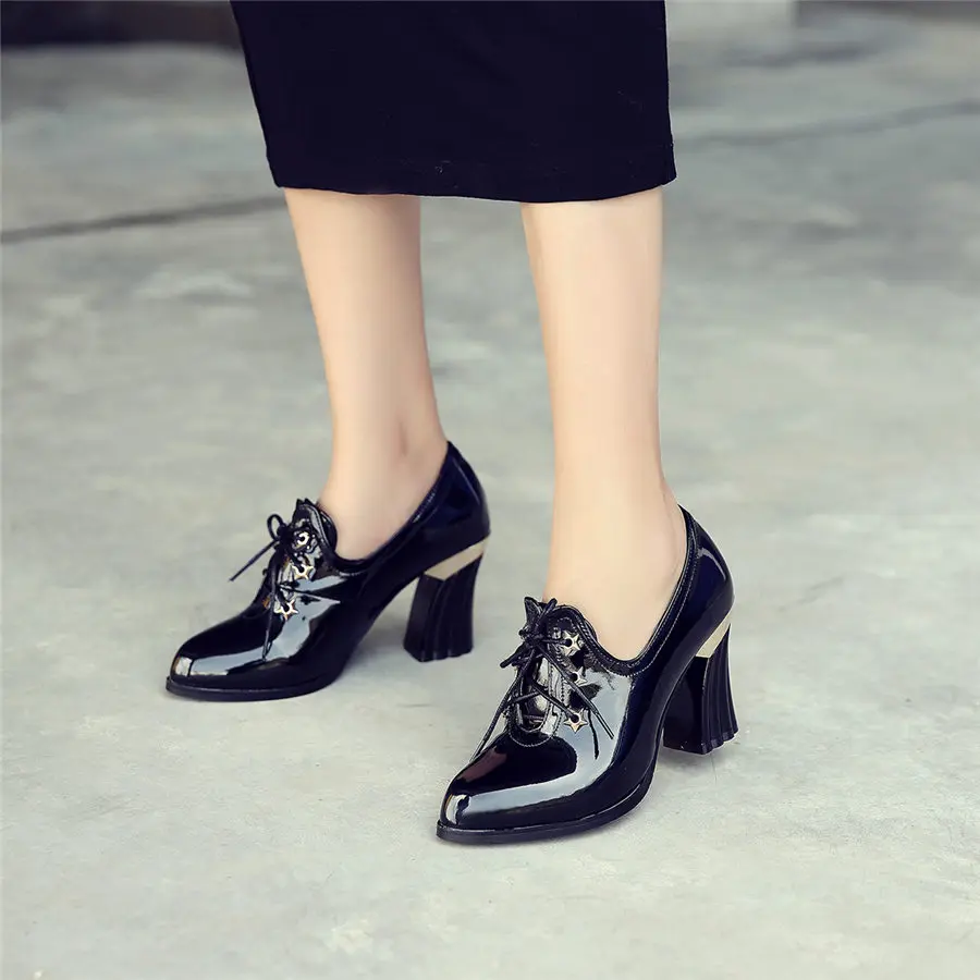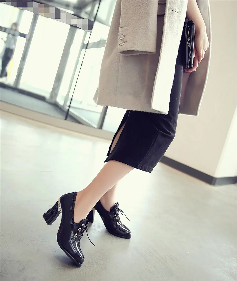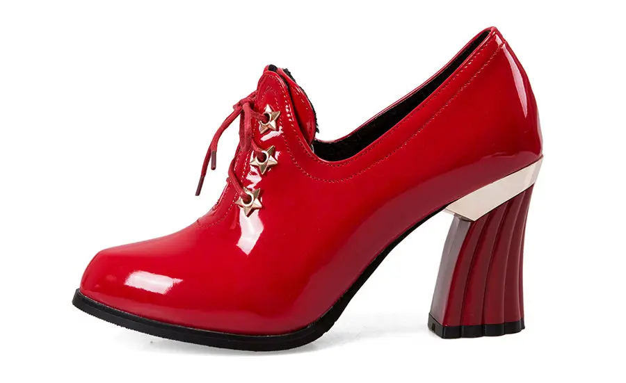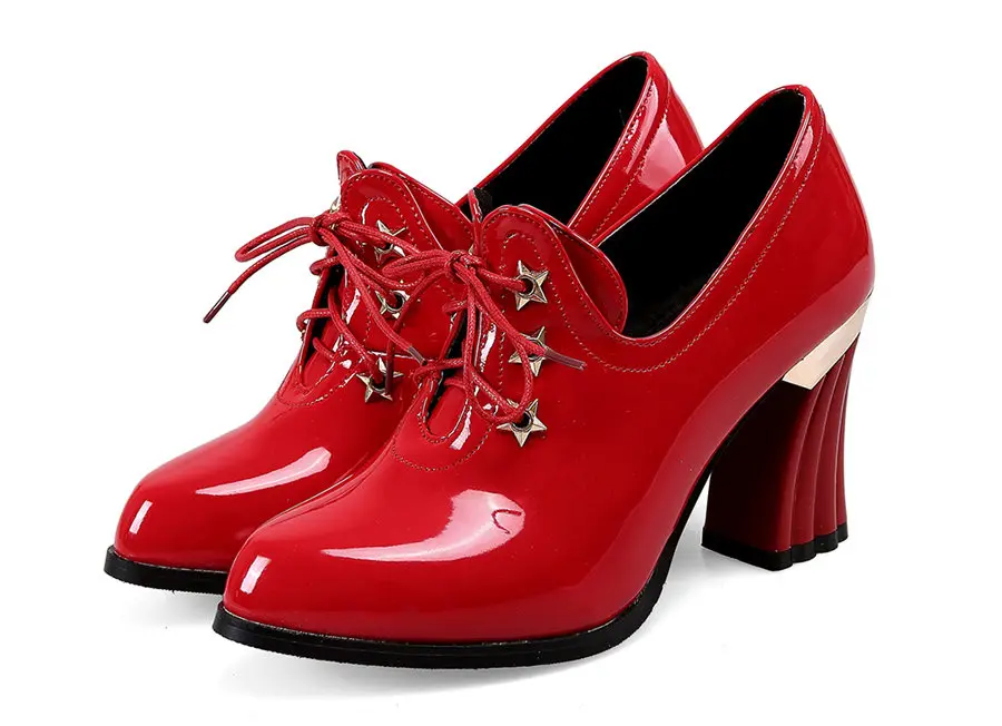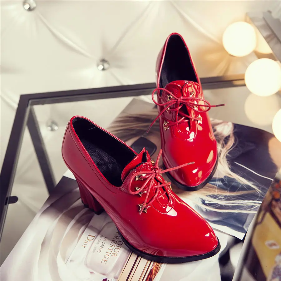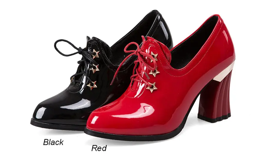 Женские оксфорды в британском стиле со звездами и ушками; Винтажные женские туфли-лодочки на высоком массивном каблуке; Туфли-лодочки из лакированной кожи на шнуровке