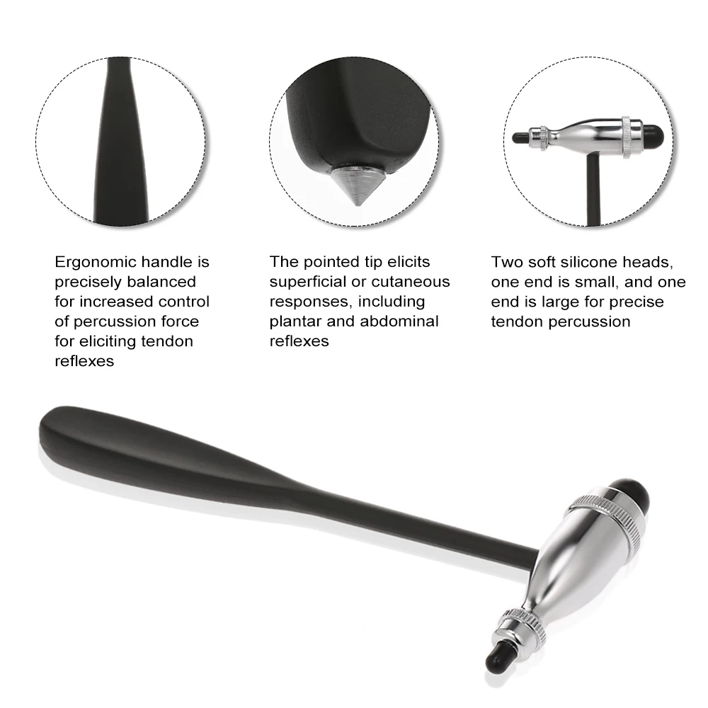 Неврологический рефлекторный Молот оснащен двумя мягкими силиконовыми головками, один конец маленький, а один конец большой для точной перкуссии сухожилия. Он предназначен для эффективного возбуждения мышечных Растягивающихся рефлексов и поверхностных или кожных рефлексов, а также подошвенных и брюшных рефлексов. Также можно использовать каналы и коллатералы для физического здоровья, расслабления ног, спины и так далее.