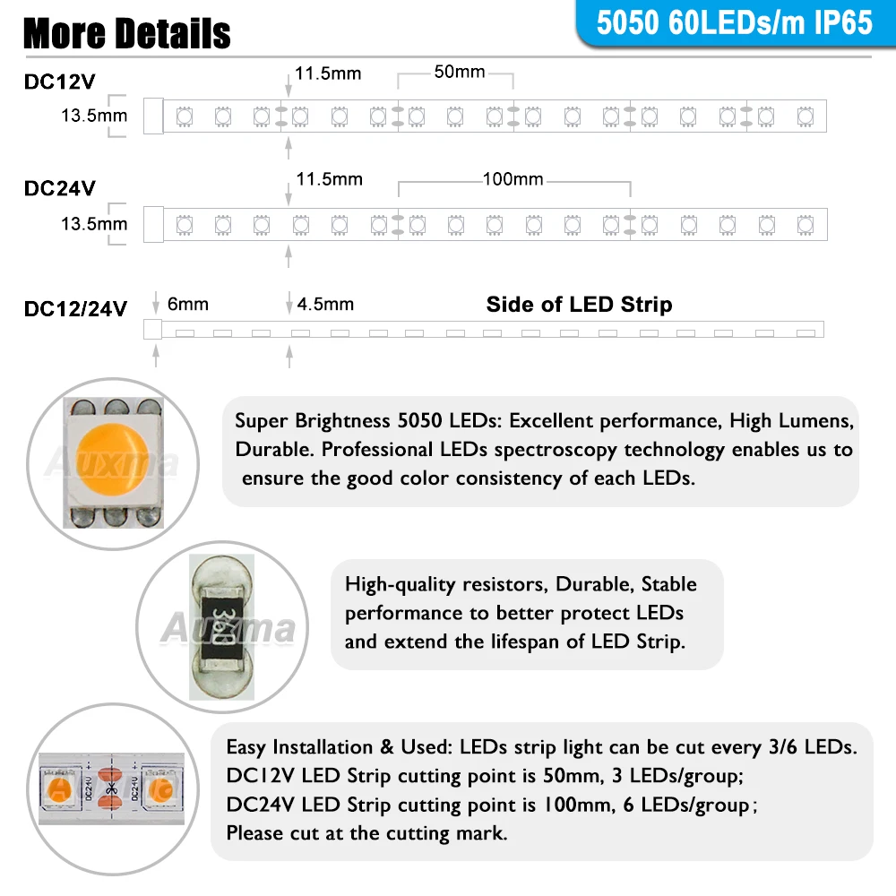 Auxma же спецификация светодиодный полосы делятся на входное напряжение DC12V и DC24V. Они имеют только различное входное напряжение. Но мощность, размер и эффективность работы одинаковы.