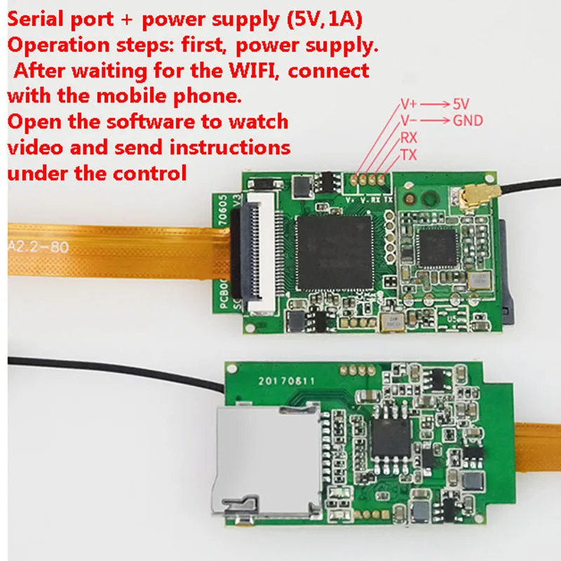 FEature:Видео WIFIПередача Hd 720PПередача инструкций последовательного портаОтправить исходный код разработки приложения androidПоследовательный порт + источника питания (5V,1A)Этапы работы: во-первых, источник питания. После ожидания WIFI, Подключите мобильный телефон. Откройте программное обеспечение для просмотра видео и отправьте инструкции под контролем