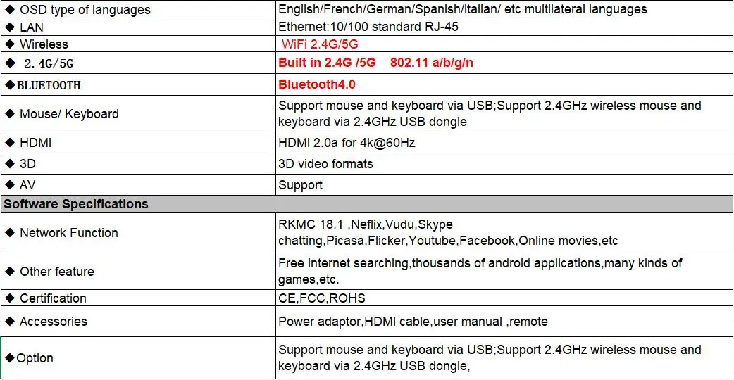 -CPU: четырехъядерный процессор RK3318 64 бит Cortex-A53 -GPU: Penta-Core Mali-450 до 750 МГц + -ОЗУ: 2 ГБ/ 4 ГБ -ROM: EMMC 16 Гб/32 ГБ/ 64 ГБ -Android 10,0 OS -2,4G/5G двойной WIFI, BT4.0 - Поддерживает режимы 3D , 4K , HDR10 и HLG -USB 3,0, цифровой дисплей Есть 3 варианта для HK1 MINI Plus: A: 2 Гб RAM + 16 Гб ROM + 2,4G и 5G Wifi +BT4.0 B: 4 Гб Оперативная память + 32 ГБ Встроенная память + 2,4G & 5G, Wi-Fi + BT4.0 C: 4 Гб RAM + 64 Гб ROM + 2,4G & 5G Wifi + BT4.0Демонстрация продукта: