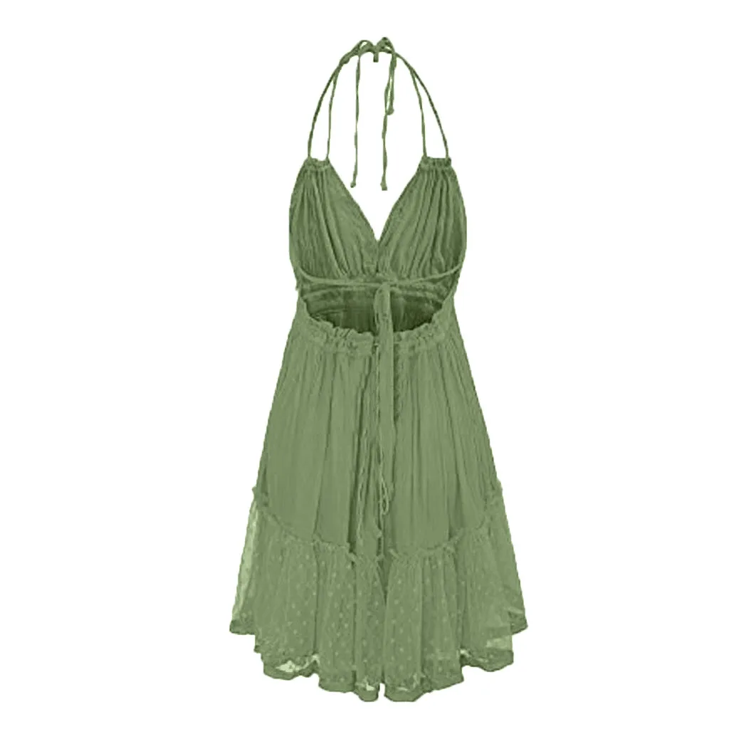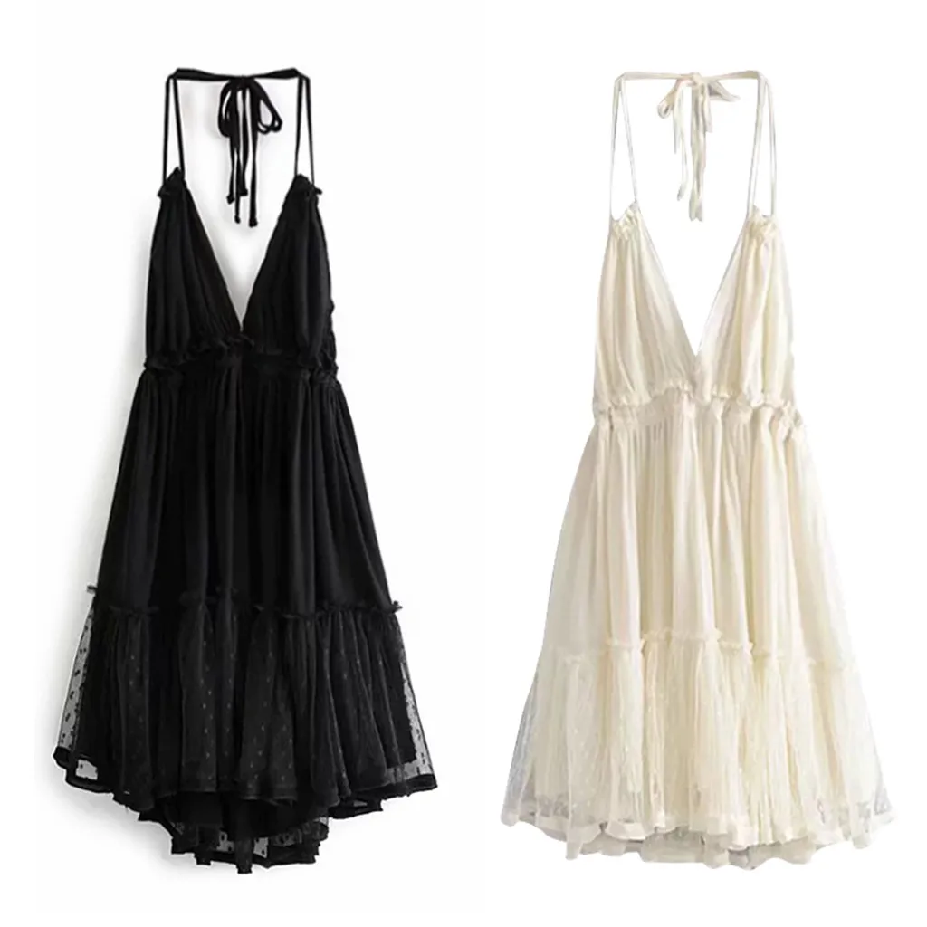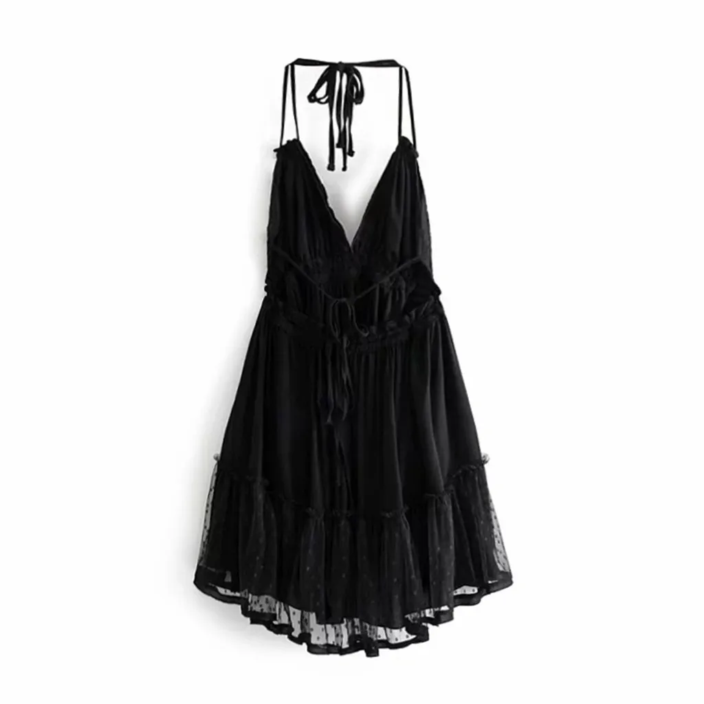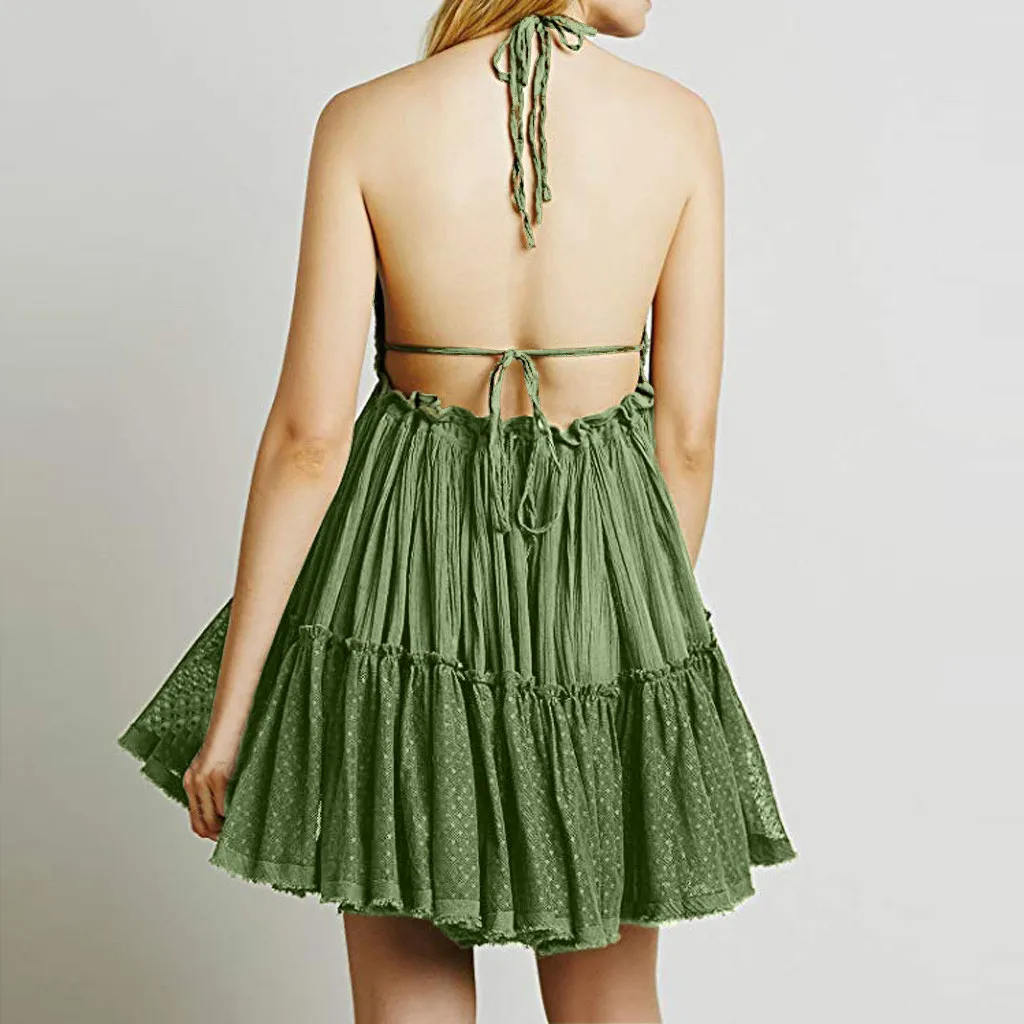 Летнее богемное платье, женское сексуальное платье с открытой спиной, вязанное крючком, гофрированное, v-образный вырез, без рукавов, Клубное коктейльное мини-платье, Оптовая продажа