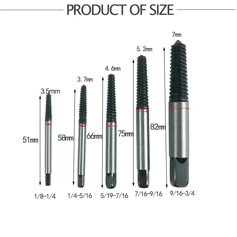Особенности: -Удаляет поврежденные винты, которые не могут быть удалены с помощью стандартной отвертки. -Удалите все виды сломанных или поврежденных головных болтов, винтов и шипов. -Удобный и эффективный, длительный срок службы. -Черный оксид для долговечности. Размеры: NO.1: 1/8 " - 1/4" NO.2: 1/4 " - 5/16" NO.3: 5/16 " - 7/16" NO.4: 7/16 " - 9/16" NO.5: 9/16 " - 3/4" Диапазон удаления резьбы: -1/8 " - 1/4": для M3 - M6 - 1/4 " - 5/16": для M6 - M8 - 5/16 " - 7/16": для M8 - M11 - 7/16 " - 9/16": для M11 - M14 - 9/16 " - 3/4": для M14 - M18 Подсветка Материал: Сталь коробка Цвет: желтый/красный/синий (Цвет, детские штаны, детские штаны для мальчика, брюки посылка Вес: 101G/3,56 унций посылка Размеры (Д х Ш х В) : 60*40*20 мм/2,36*1,57*0,79 дюймов Упаковочный лист: Винтовые экстракторы x5 Коробка для посылка x1