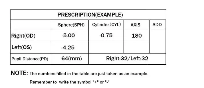 Предоставьте нам следующую информацию, чтобы мы могли выбрать правильный объектив для вас (рецепт), или сфотографировать рецепт или отсканировать его нам! OD (справа): SPH ?, CYL?, AXIS? ОС (слева): SPH?, CYL?, AXIS? PD (Дальний или Ближний): ? (Расстояние зрачка) Обратите внимание на это: если у вас нет цилиндра (CYL), вам не нужно его предлагать и не нужно также писать ось. Вы можете ответить на него, как на следующие примеры: По рецепту (пример) Прочность SPH цилиндр оси Справа (OD) -5,00-0,75 180 Слева (ОС)-4,25 PD:64 мм (OD = Справа: 32/OS = слева: 32 мм) Примечание: цифры, заполненные в таблице, приведены в качестве примера. Не забудьте написать символ «+» или «-»