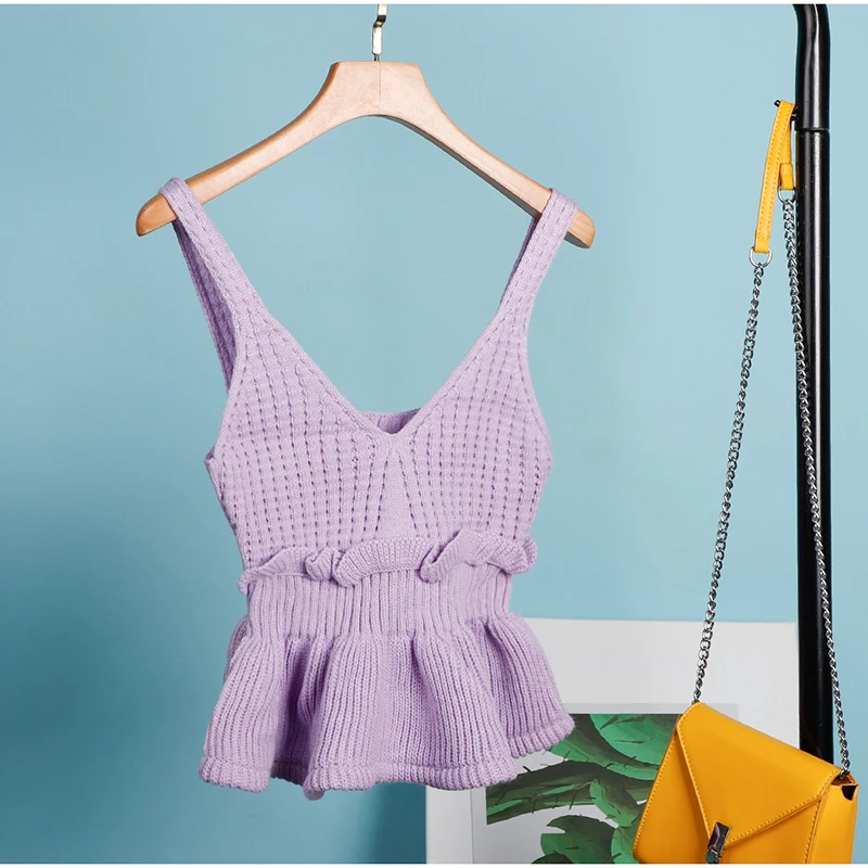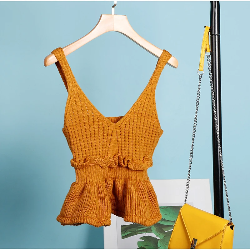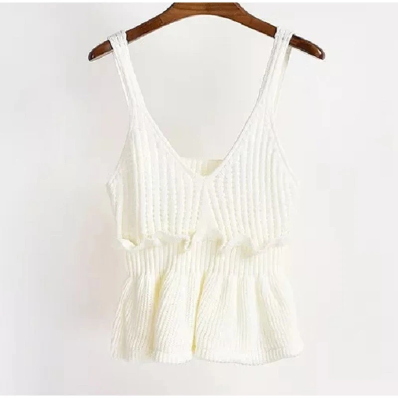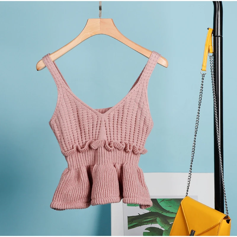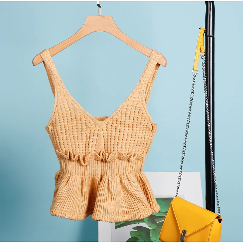 Женский трикотажный ребристый укороченный топ с оборками и v-образным вырезом, майка без рукавов с открытой спиной, женский топ на бретелях