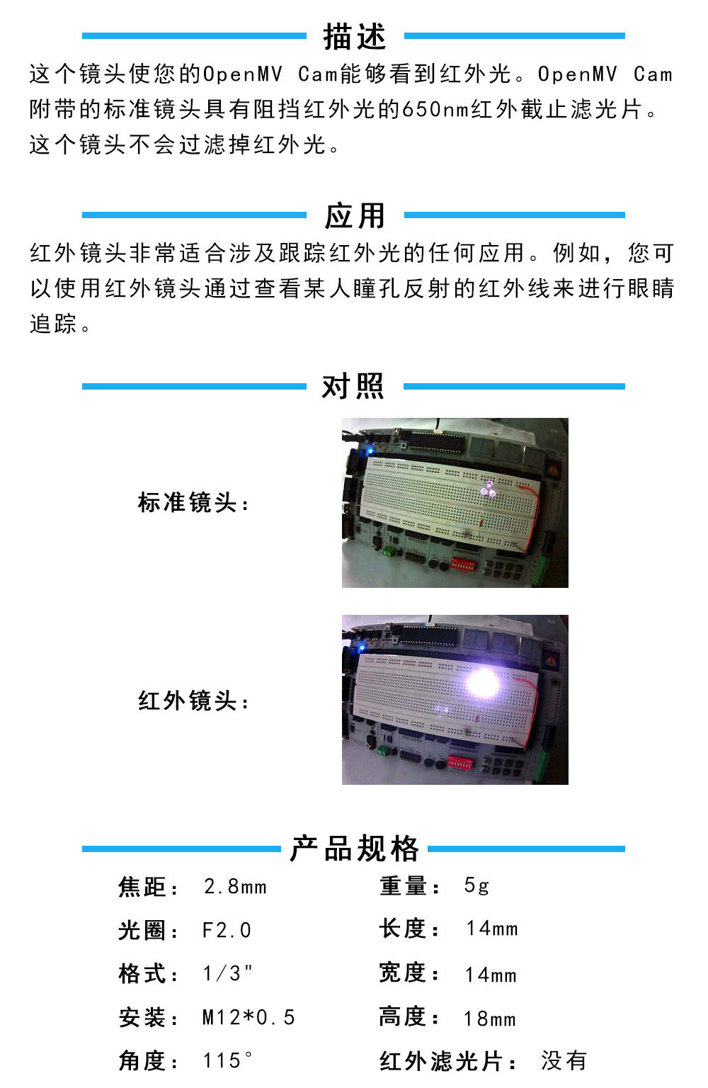Это инфракрасный объектив 2,8 мм для OpenMV. Он удаляет ИК-фильтр 650 нм на задней части объектива и может видеть инфракрасный свет.