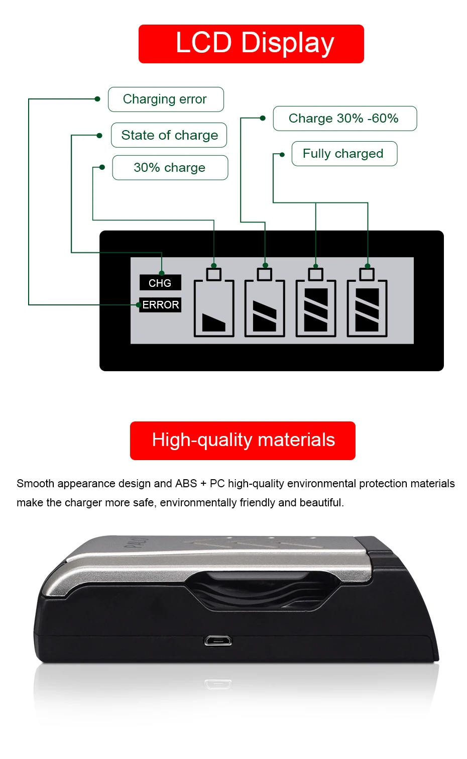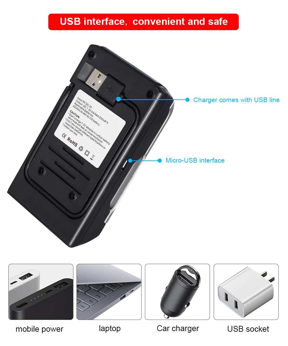 1. Умное usb-устройство для зарядки аккумуляторов, для 1,2 V AA, AAA, никель-металл-гидридных или никель-кадмиевый аккумулятор перезаряжаемый аккумулятор. 2. ЖК-дисплей, ЖК-экран будет отображать процесс зарядки аккумулятора. 3. Независимый зарядный канал, множественная защита, поддержка быстрой зарядки аккумулятора 4. USB зарядка, применима по всему миру, для любой страны 5. В конце процесса зарядки Встроенный микрокомпьютер преобразует режим зарядки от быстрой зарядки в непрерывную зарядку, обеспечивает полную зарядку аккумуляторов и предотвращает чрезмерную зарядку 6. Постоянный ток предотвращает колебание тока, обеспечивает безопасность зарядки. 7. Функция автоматического распознавания: Уникальный алгоритм для обнаружения плохих или дефектных ячеек, автоматически обнаруживает незаряжаемый или одноразовый аккумулятор и прекращает зарядку. Партномер: 1,2 V AA AAA батарея зарядное устройство Вход: 5 В DC 2A Выход: DC 1,2 в AAA/AA 500mA * 4