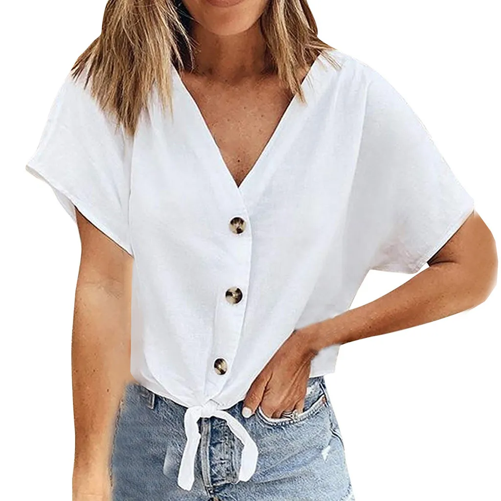 Женская летняя блуза с коротким рукавом и v-образным вырезом на пуговицах, Повседневная рубашка, топы