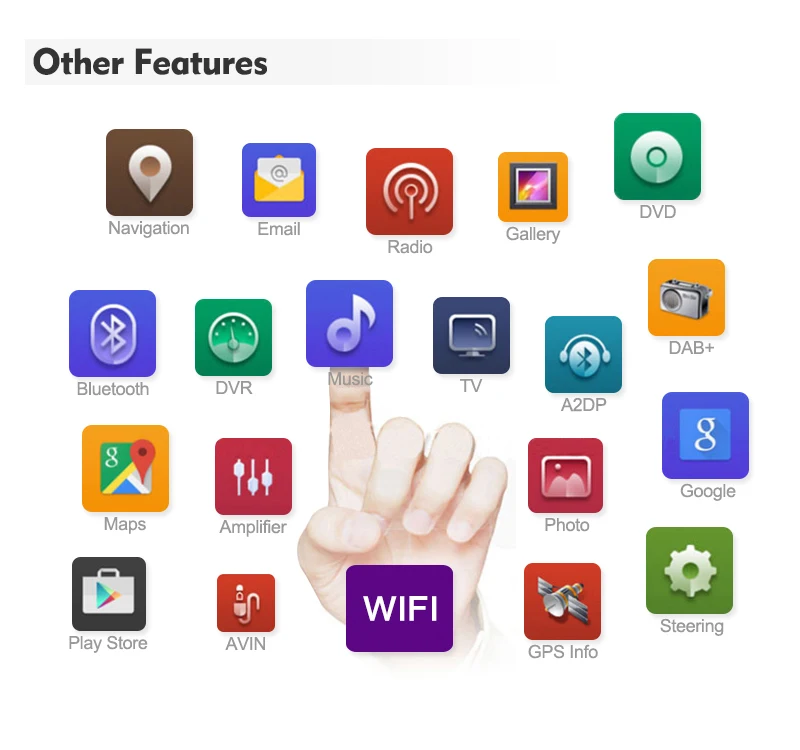 Поддержка функции DVR Встроенный WIFI Поддержка внешнего сигнала 3G ключ Быстрый ответ после освещения автомобиля: в течение 1 сек для начала, в течение 2 секунд для звука, Поддержка HD 2D & 3D игры Передняя и задняя камера может работать вместе Поддержка SD/MMC/SDHC SD порта, SDHC поддерживает Макс 32G, HDD Bluetooth поддерживает все бренды сотовых телефонов, запись телефонной книги, воспроизведение музыки, поддерживает имя поиска по A-Z Поддержка видео: WMV(VC1 код) AVI (H.264, MPEG4 ASF, WMV),MP4 (H.263, H.264, MPEG4), MPG(MPEG-2),M4V(H.264, MPEG4)