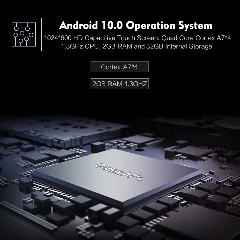 Процессор: Cortex A53 Quad-Core 2G DDR3 оперативной памяти Построенный в точкахи 16 Гб 1024*600 аналагово-цифровой экран