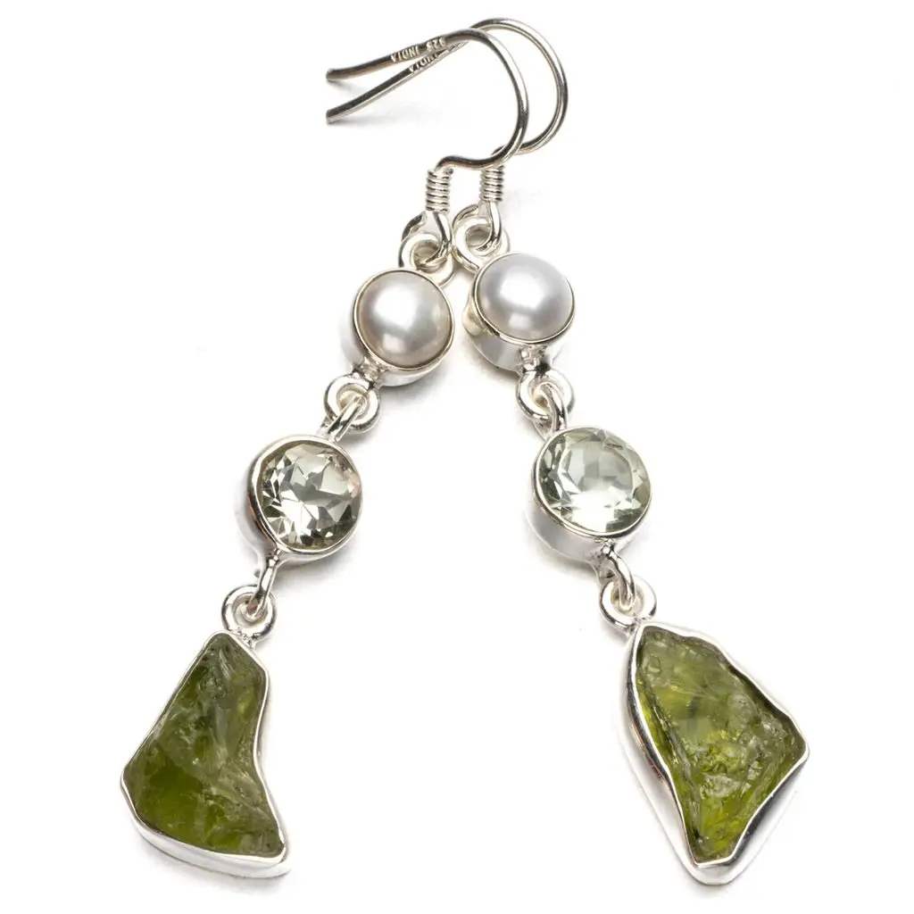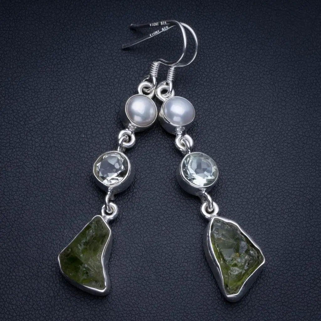 Натуральный Необработанный молдавит, зеленый аметист и речной жемчуг 925 Висячие серьги из серебра 925 пробы 2 1/4 "; R2176