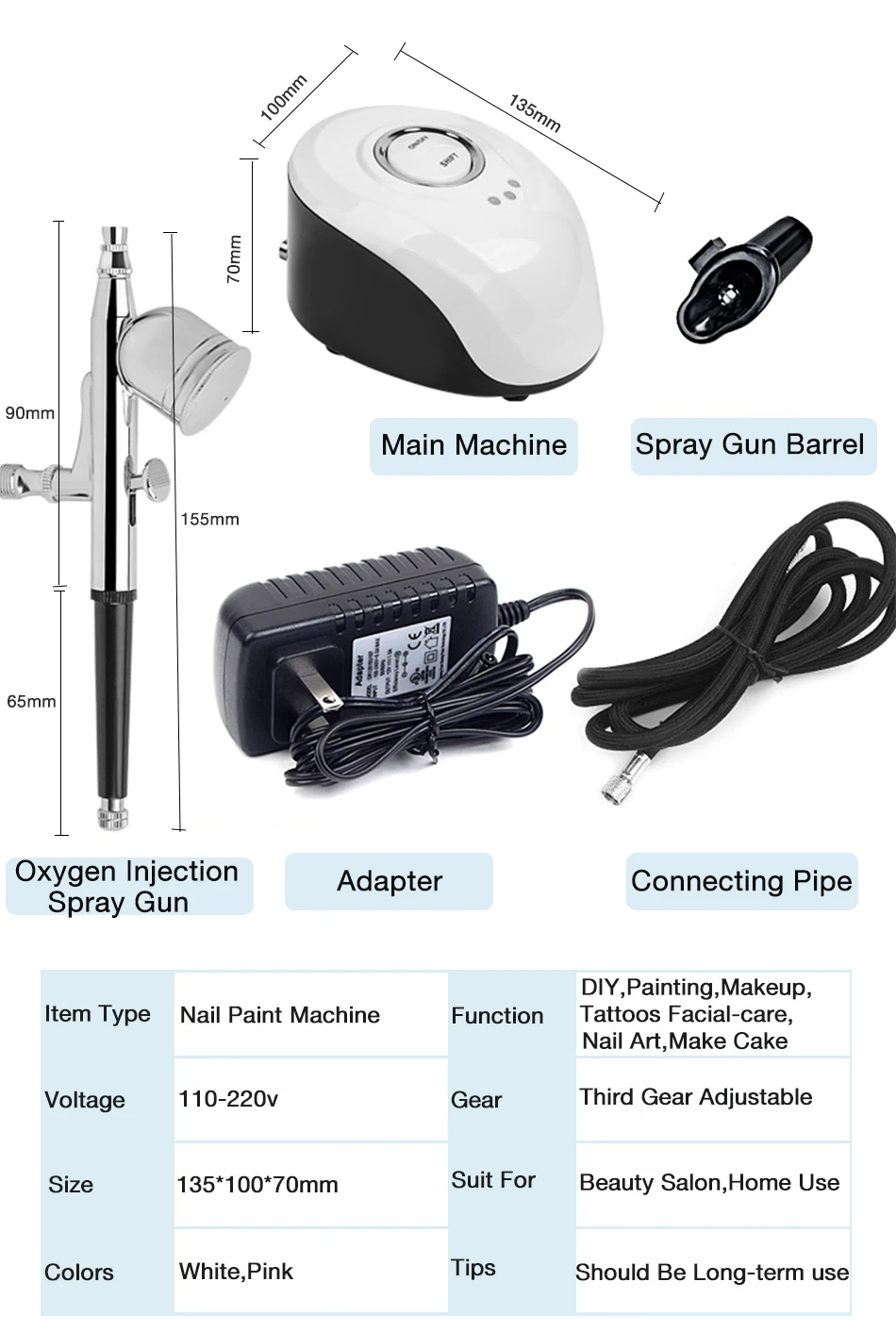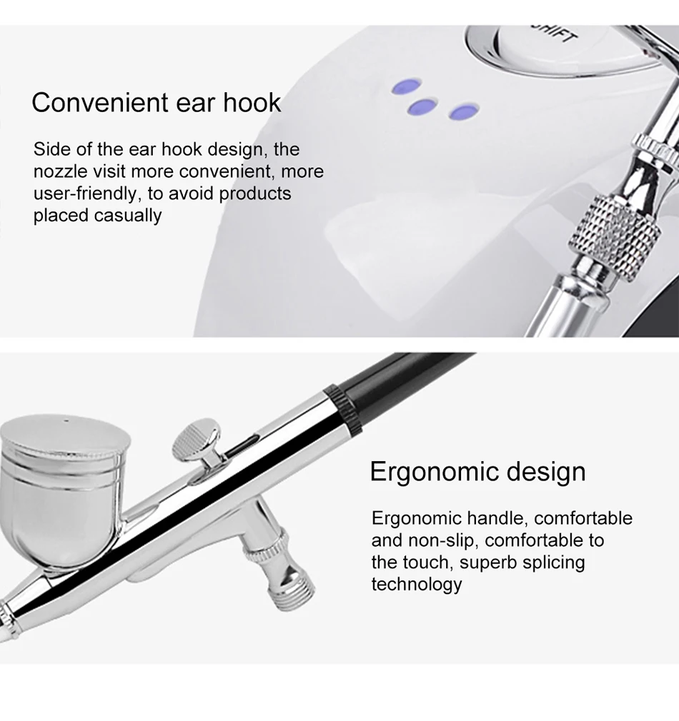 Особенности: 1. Простой, удобный и легкий в управлении 2. Простая установка, труба соединена с основным двигателем, и форсунка может быть использована 3. Боковые подвески для ушей, удобно для размещения насадки, так что продукт не может быть размещен где угодно 4. Эргономичный дизайн, удобная и нескользящая, изысканная технология сращивания 5. Используется высококачественный экологичный АБС-материал, более безопасный для здоровья и более успокаивающий Посылка включает в себя: 1 * Mainframe 1 * пистолет для инъекций кислорода 1 * ствол пистолета 1 * адаптер для зарядки 1 * Соединительная труба 1 * Руководство по эксплуатации Примечание: 1. Спичечный продукт должен быть жидким средством для ухода за кожей, таким как лосьон, эссенция, эссенция 2. Будьте внимательны, чтобы избежать распыления в рот или нос 3. Каждый раз используйте устройство, пожалуйста, очистите бутылку и сутенер, чтобы предотвратить блокирование из-за замерзающей жидкости 4. При возникновении любых вопросов, пожалуйста, свяжитесь с нами, мы ответим в течение 24 рабочих часов и предложим вам подходящее решение