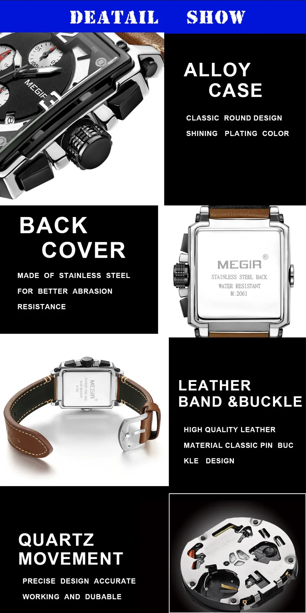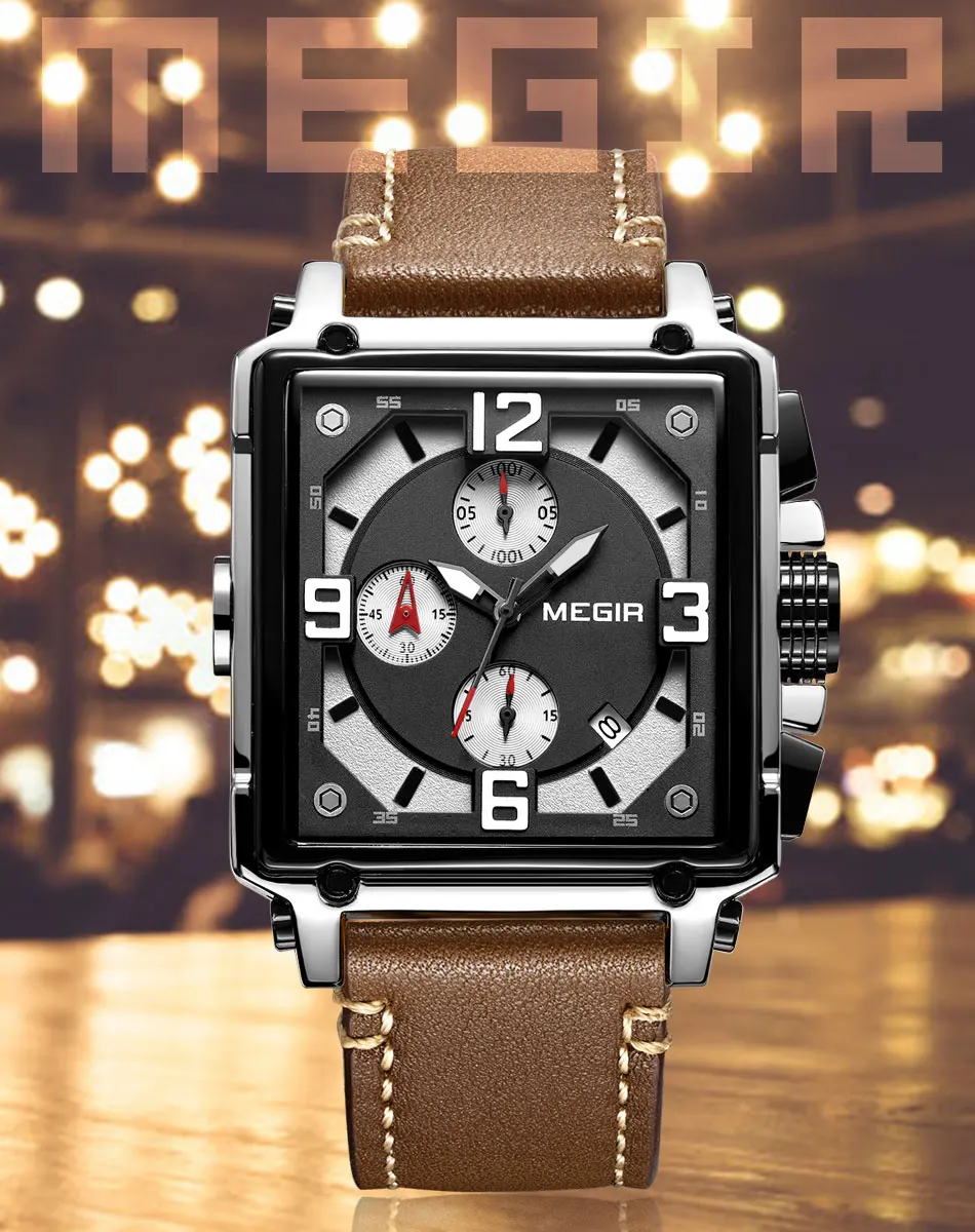 MEGIR модные роскошные Бизнес Мужские кварцевые часы многофункциональный хронограф водонепроницаемый Прямоугольный циферблат кожаный ремешок наручные часы