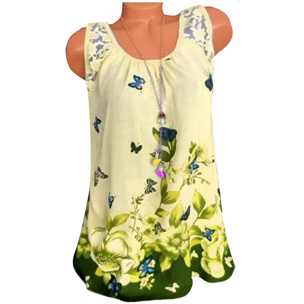 Женский модный кружевной Летний жилет с принтом без рукавов, футболка, Топы, блузка, Повседневная