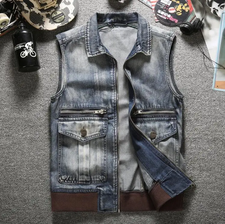 Мужской Байкерский джинсовый жилет, светильник, синий джинсовый жилет на молнии, уличная одежда, облегающие мотоциклетные Клубные куртки без рукавов для мужчин