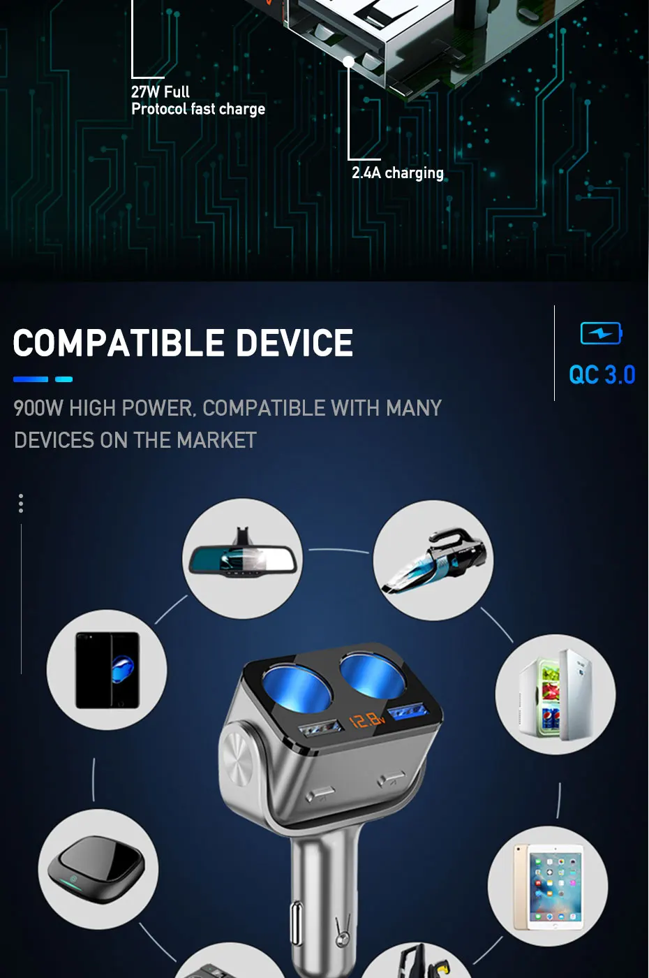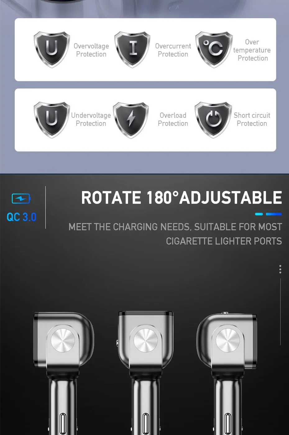 Прикуриватель сочетает в себе 2 гнезда прикуривателя с 2 usb-портом для зарядки, чтобы преобразовать прикуриватель в многофункциональный адаптер питания для одновременной зарядки нескольких устройств.