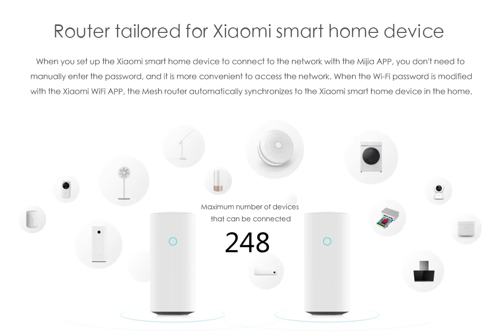 Стабильный охват, ubiquitous, AC1300 беспроводной + 1000 м LAN + 1300 м многоканальный высокоскоростной Гибридный передачи. 4-ядерный процессор Qualcomm DAKOTA, 4 самостоятельных усилителя сигнала, полноразмерный WiFi Безшовный охват, оптимизированный для Xiaomi smart home.
