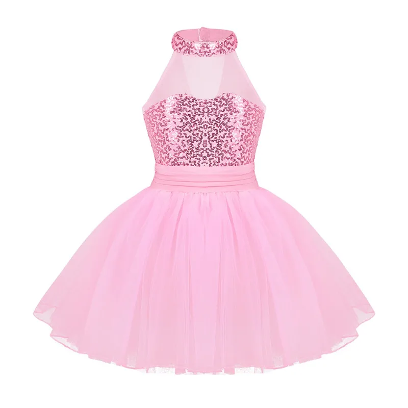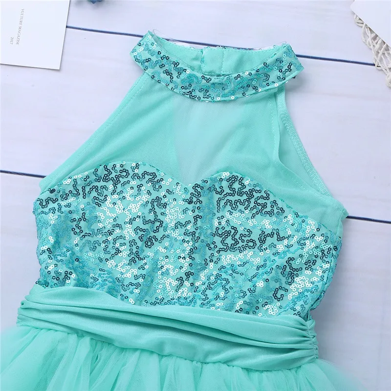 Детское балетное платье с воротником для девочек гимнастическое трико для девочек, Сетчатое платье для балета без рукавов с блестками Одежда для танцев